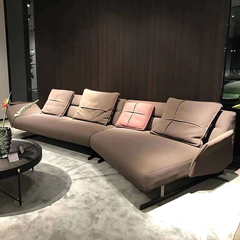 イタリアンミニマリズムのリビングルーム用ユニークデザイン本革ソファ|デザイナーセレクションのダウン入りビッグコーナーソファ、ブダペストスタイルで贅沢なくつろぎを。