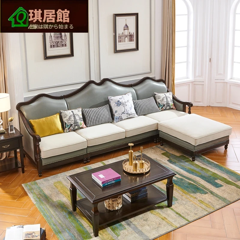 アメリカンスタイルの本格木製ソファ - 高級本革使用、洗練されたデザインの彫刻入り大容量123型コンビネーション家具。贅沢な居心地とスタイルを兼ね備えた、あなたのリビングを彩る一品!