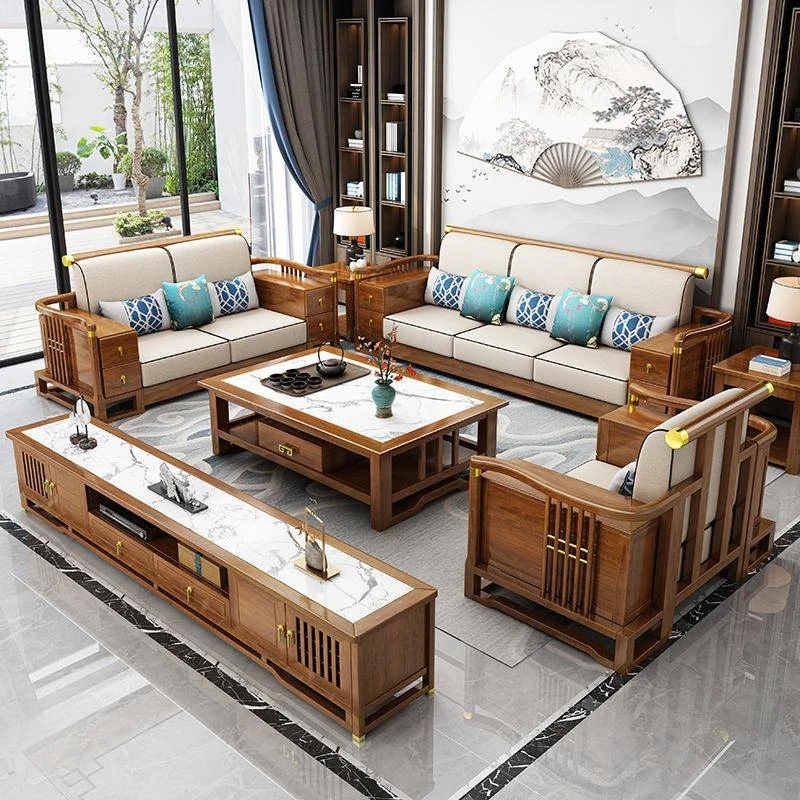 新中式ウッドブラックオーク全実木ソファセット - 冬夏兼用、大小戸型に最適な中国風リビング家具で、お部屋をスタイリッシュに演出!