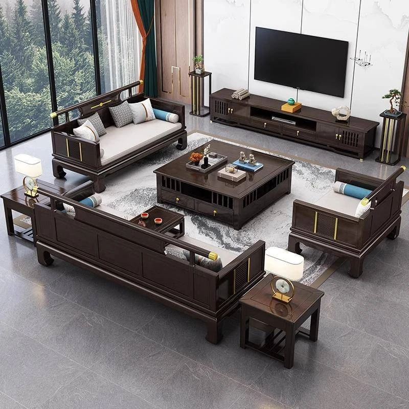 新中式高級実木ソファセット - モダンな古典的デザイン、豪華な別荘スタイル。ウッドウィルの高品質な黒檀材使用、サイズも豊富でリビングルームに最適なアイテムです。おしゃれな空間を演出します!