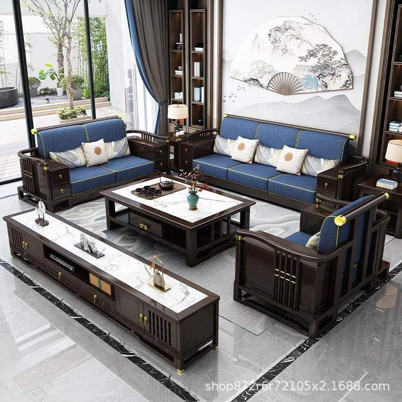 新中式スタイルの無垢材ソファセット - 現代的な中式ヴィラのリビング家具、全てのサイズの住宅にぴったりな禅の雰囲気をお届けします!快適さと美しさを兼ね備えたこのソファで、あなたの空間を特別なものに。