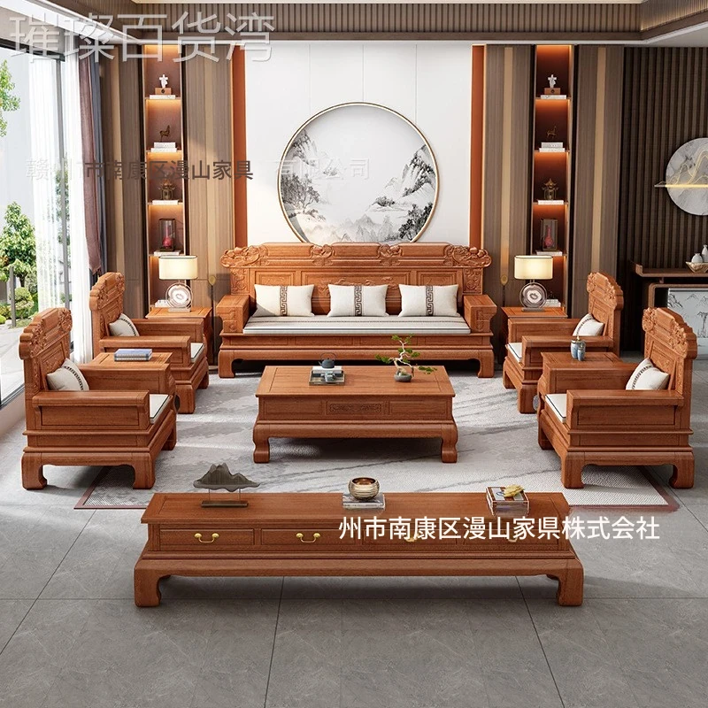 新中式ウッドウーロン木製モダンファミリー用小型実木ソファー、リビングルーム用豪華デザインのロングソファ、メーカー直販でお得!