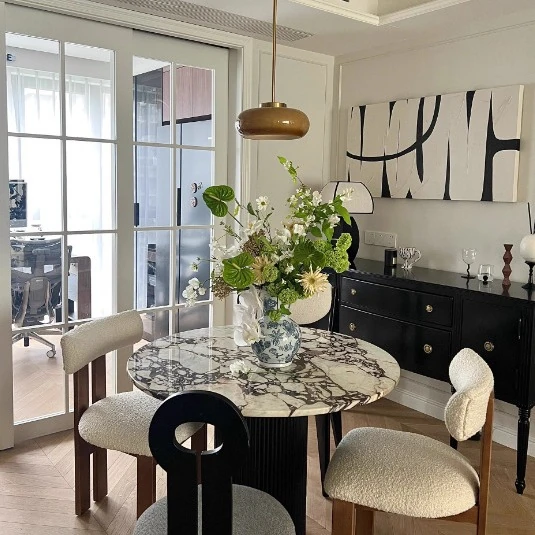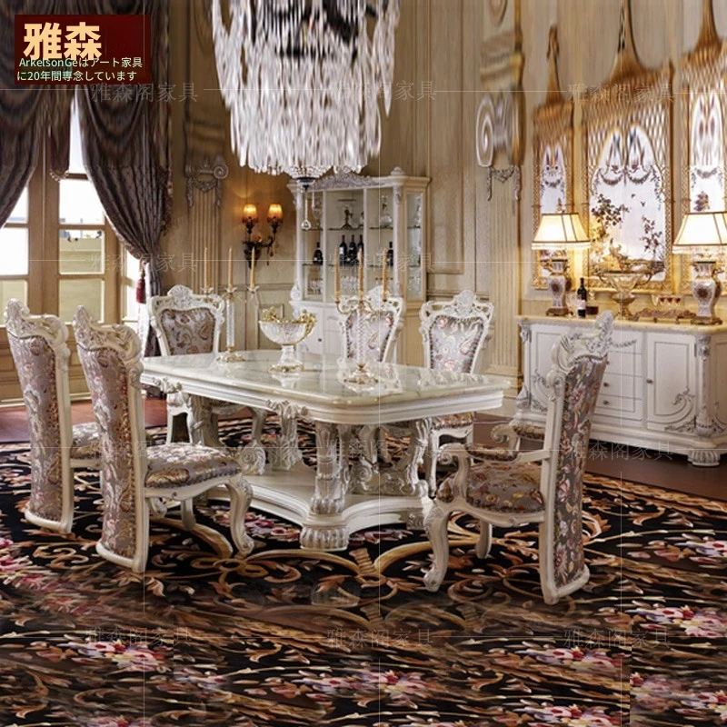 フランス風クリームマーブル聖杯ダイニングテーブル|エレガントな黒の楕円形スレートテーブル|おしゃれな家庭用ネット人気ダイニングセット!