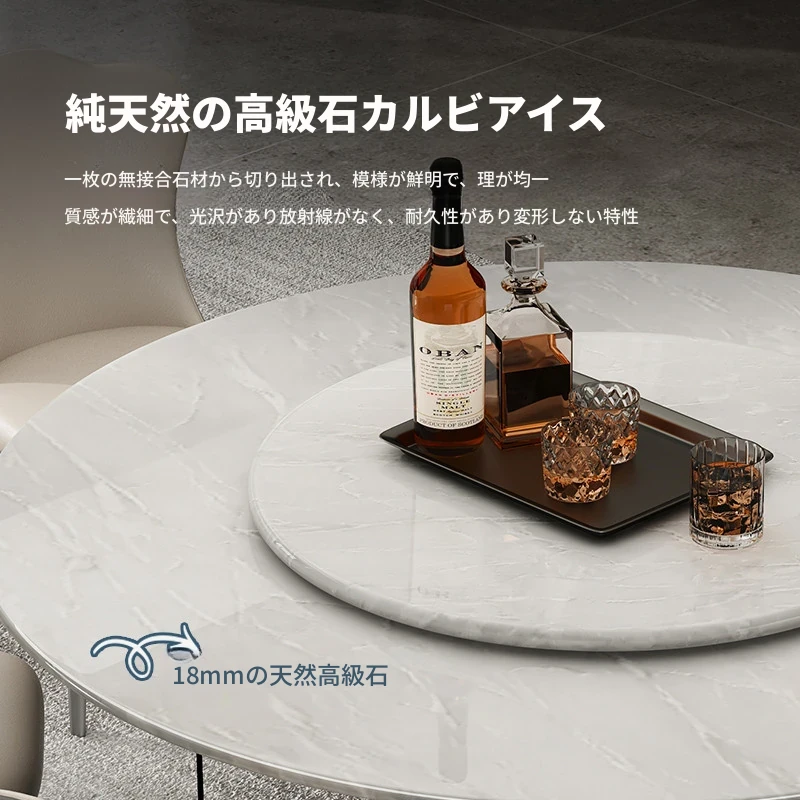 天然大理石製のラウンドダイニングテーブル - 高級感溢れる回転式、雪山の美しさを感じる六人用テーブルで、特別な食事シーンを演出します。