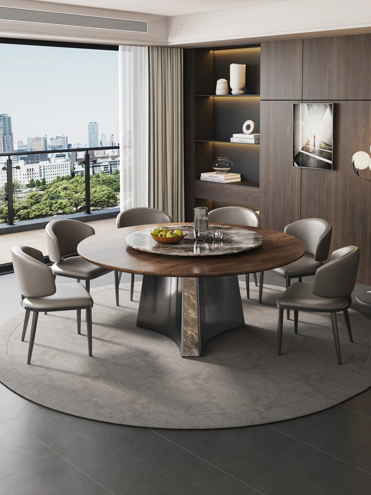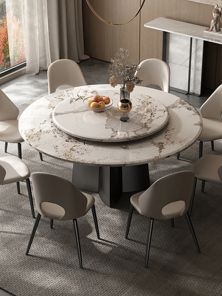 モダンシンプルな大理石ダイニングテーブルセット|10人用実木ラウンドテーブル|家庭やホテルに最適|電磁調理器&鍋料理対応|快適な食事体験を提供!