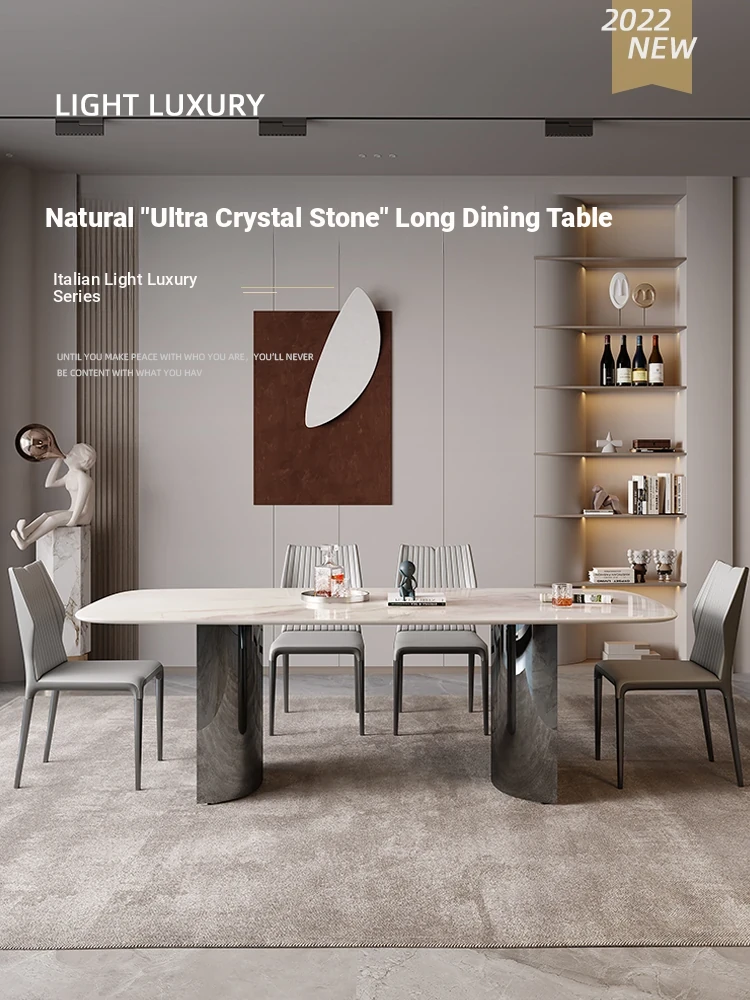 Elegant Italian High-End Natural Super Crystal Stone Long Dining Table Set – Modern Minimalist Design for Small Spaces, Complete with Chairs and Rock Plate Features.