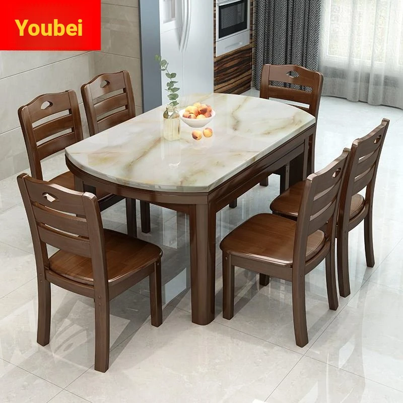 Modern Minimalist Round Marble Dining Table Set for 6 - Space-Saving Natural Solid Wood Dining Table and Chairs for Home Use