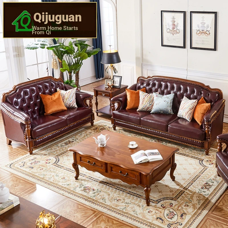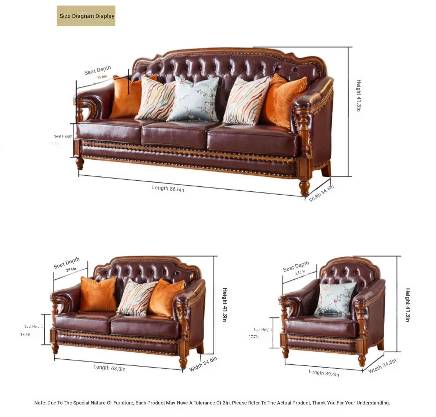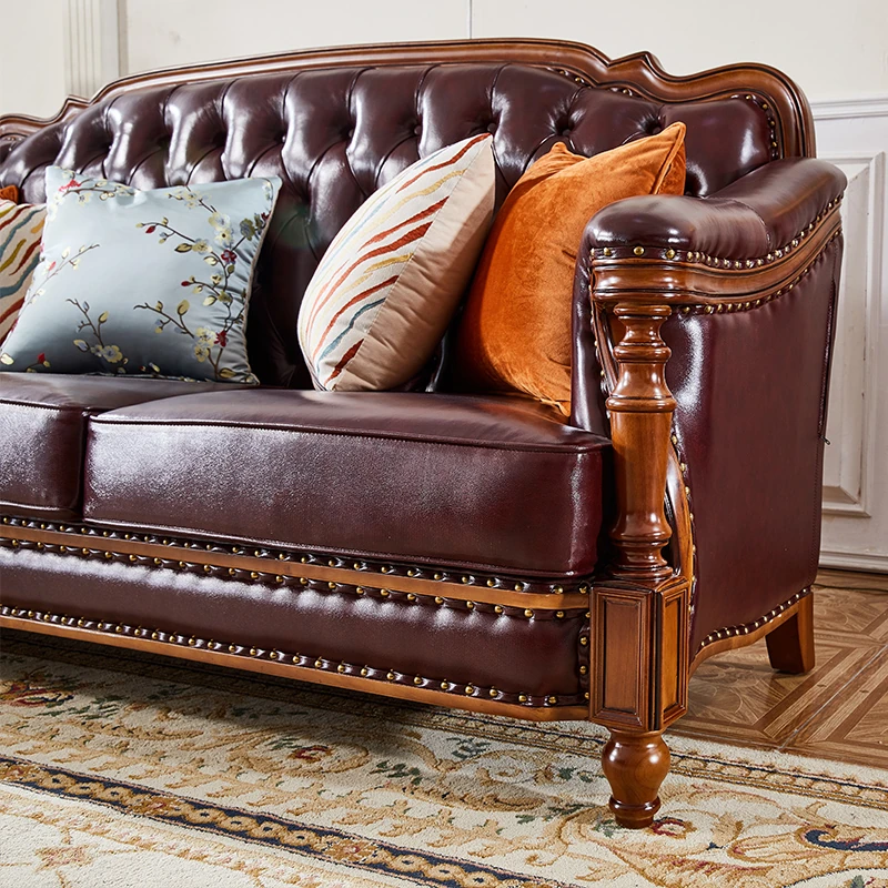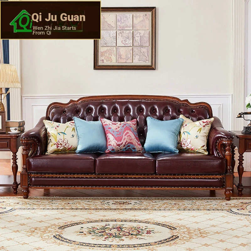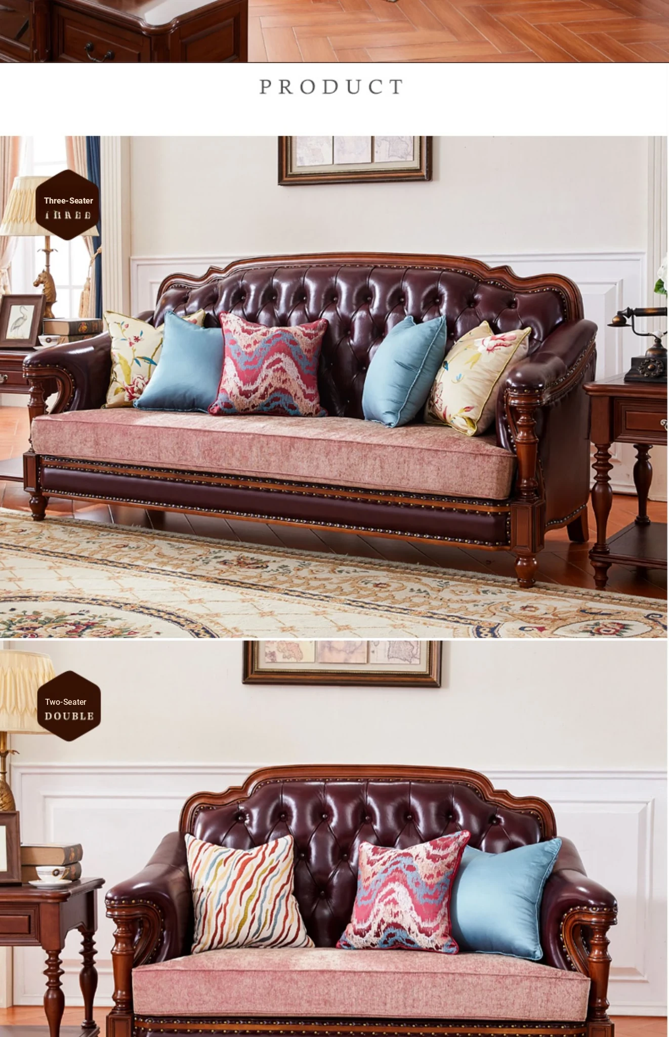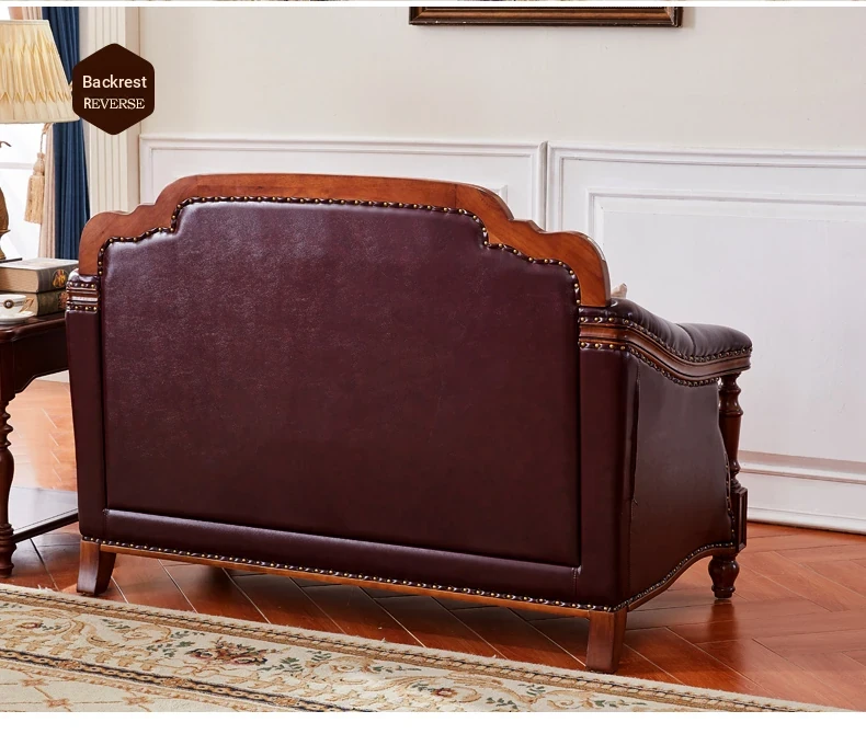 Luxurious American Genuine Leather Sofa Set - Top Grain Cowhide with Solid Wood Frame, 3-Seater Living Room Furniture in Elegant Red-Brown Color