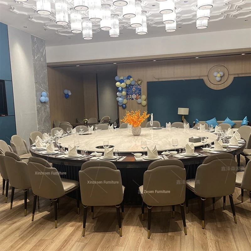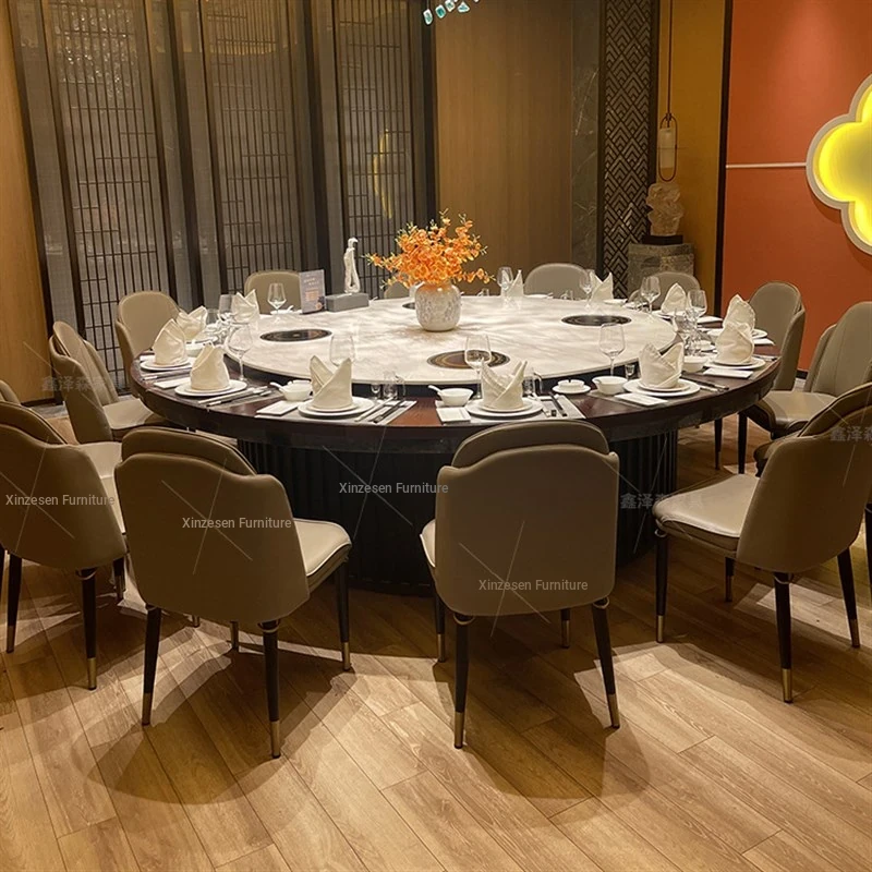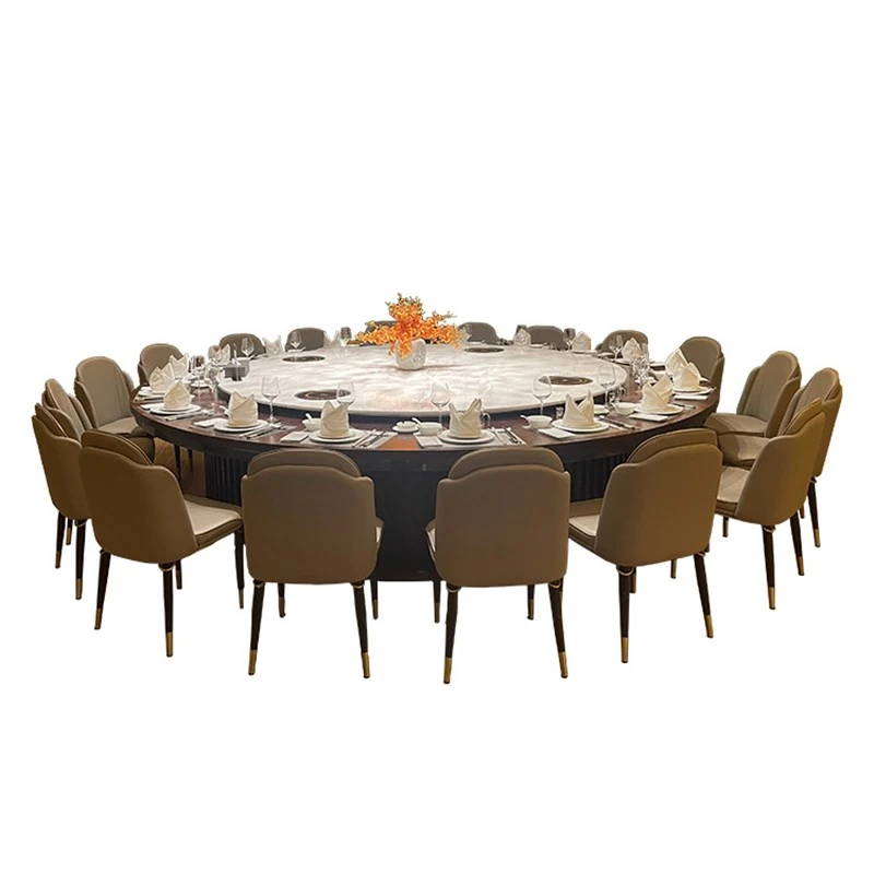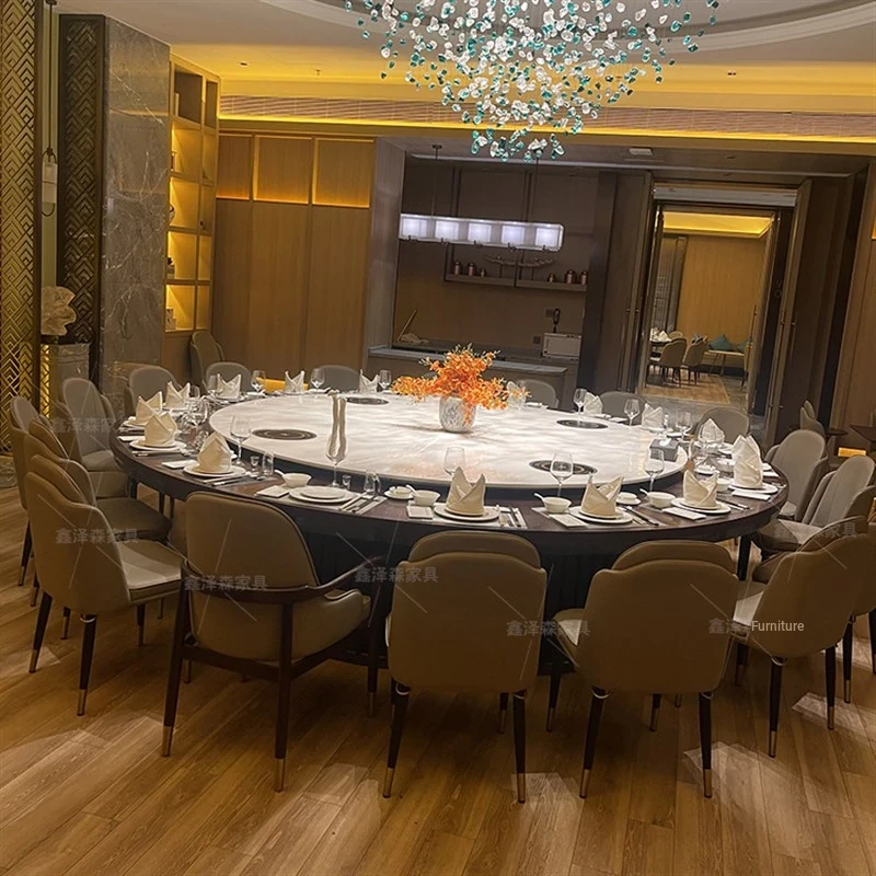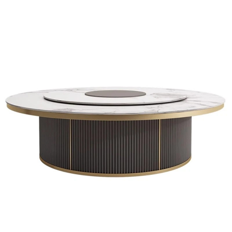 Luxury Electric Dining Table with Hidden Induction Cooktop – Round, Rotatable, and Height Adjustable – Ideal for Hotel Private Rooms, Featuring Elegant Rock Plate and Solid Wood Design.