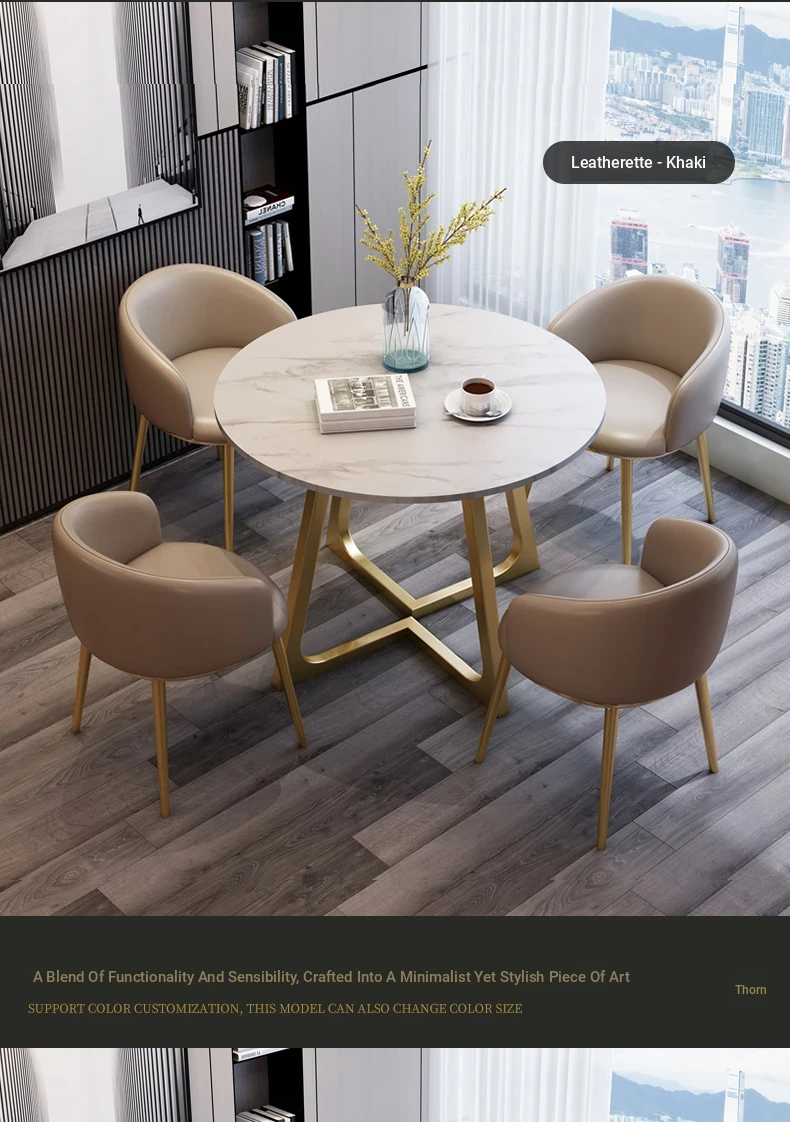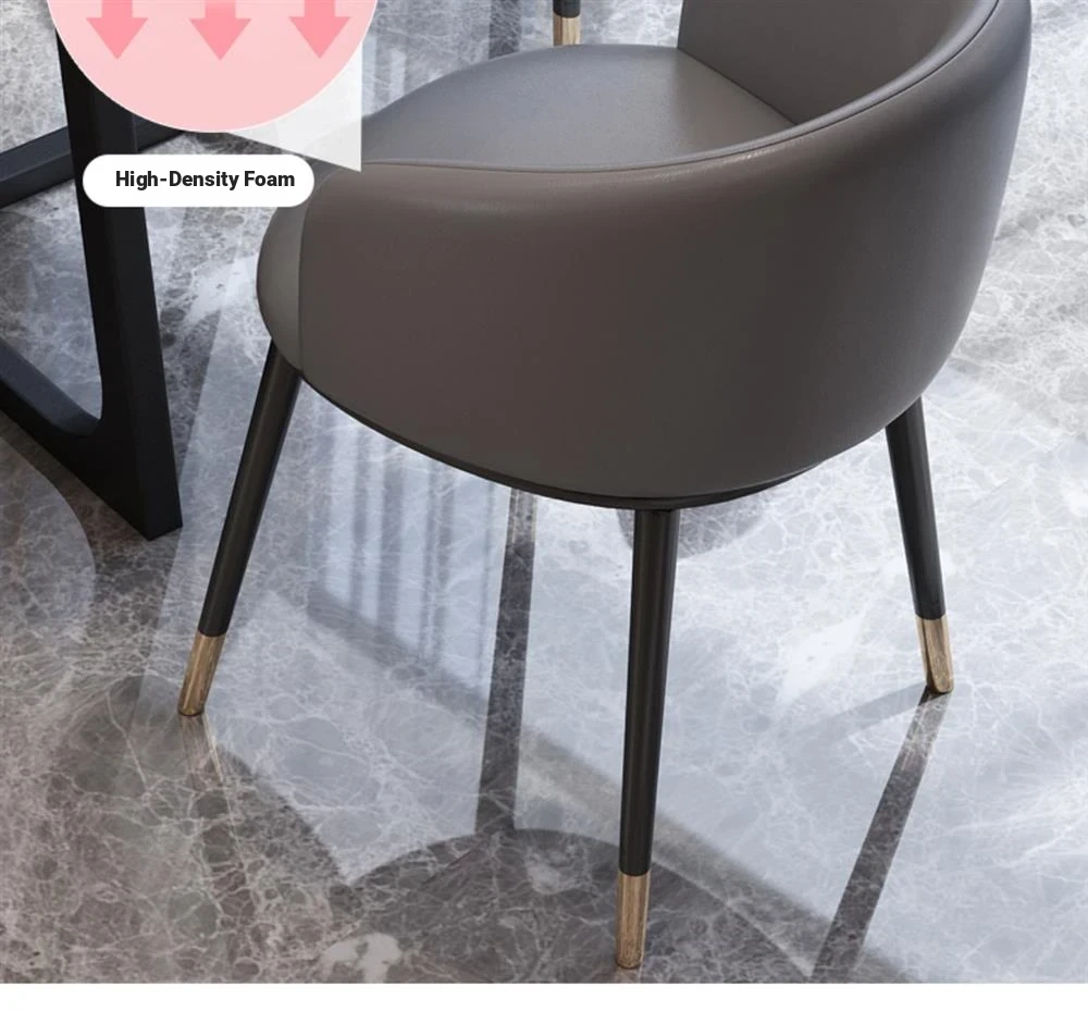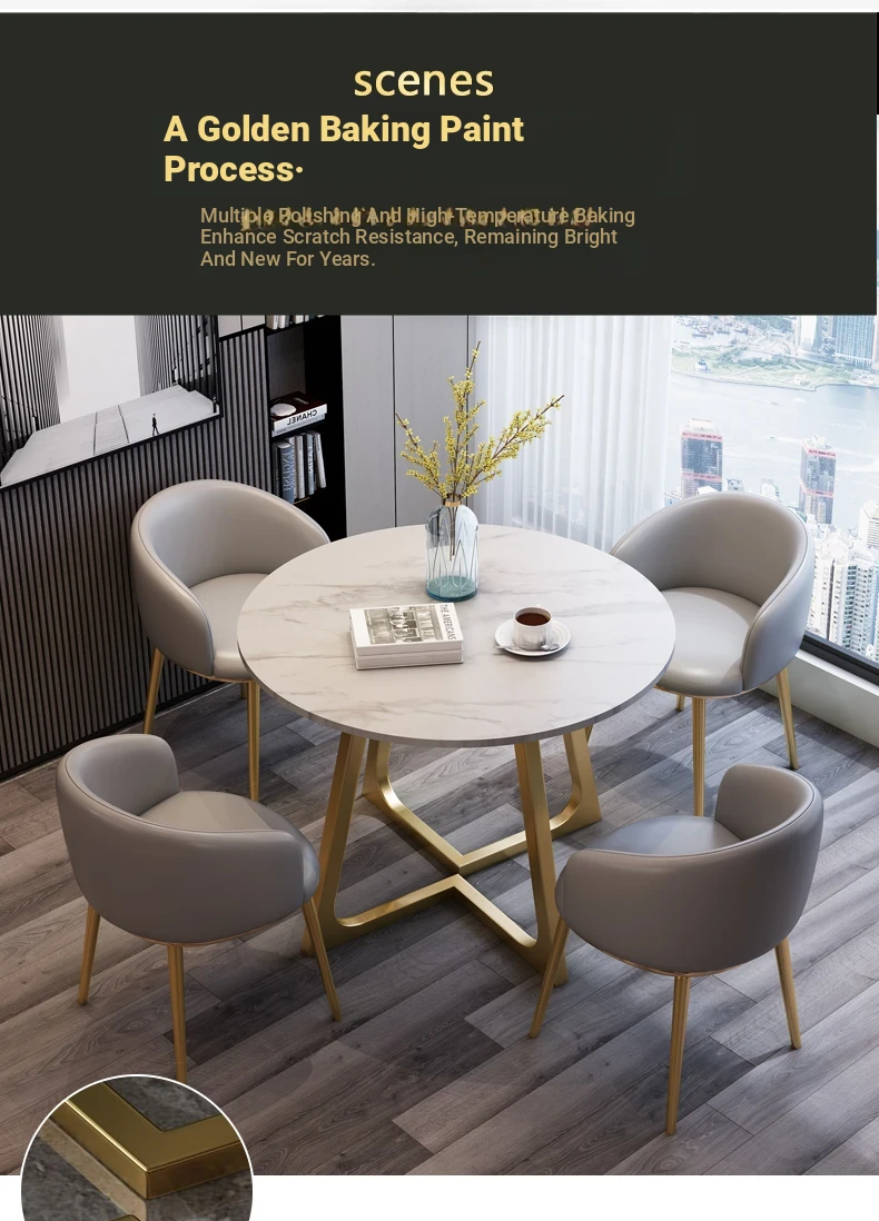 One table and four chairs gray PU leather gold feet white matte rock board