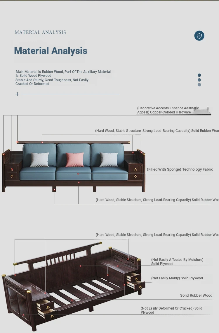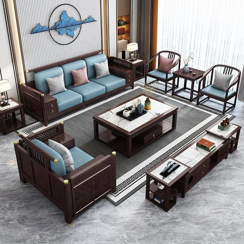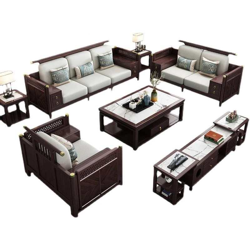 New Chinese Style Solid Wood Sofa - 3-Seater Corner Design for Living Room, Perfect for All Seasons, Ideal for Spacious Homes.