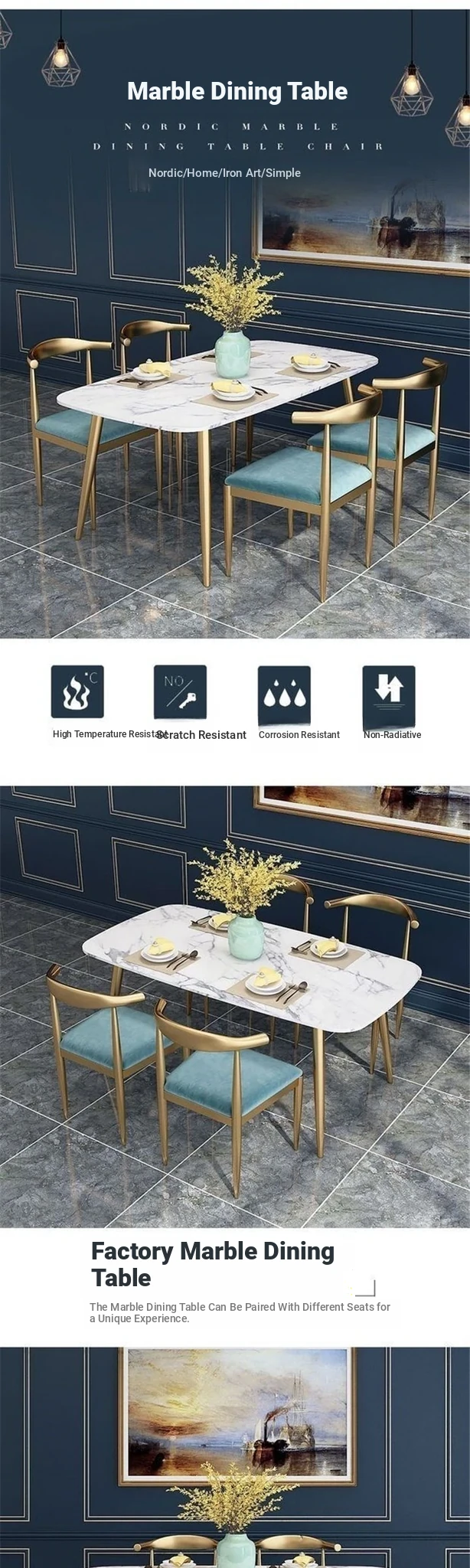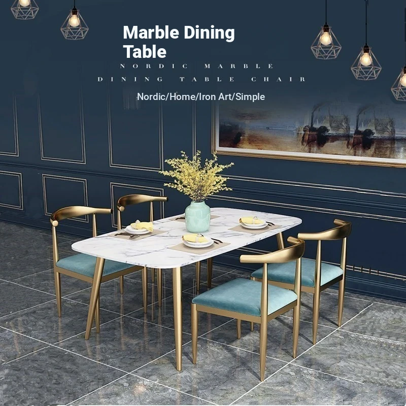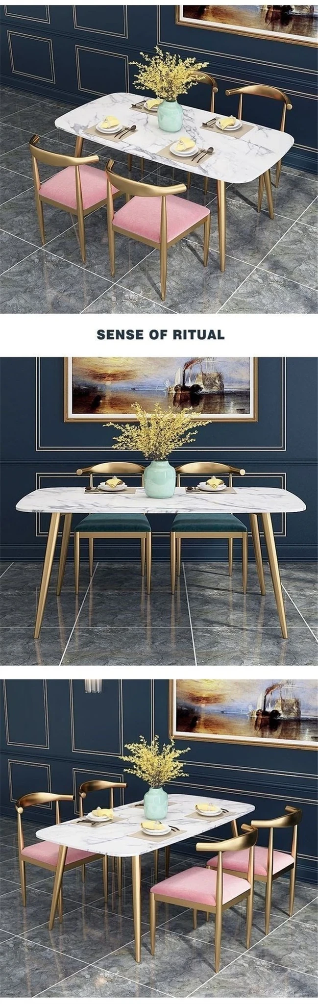 Nordic Minimalist Marble Dining Table for Small Spaces - Elegant Rectangular Table with Iron Gold Accents & Luxurious Horn Chairs for Home Use