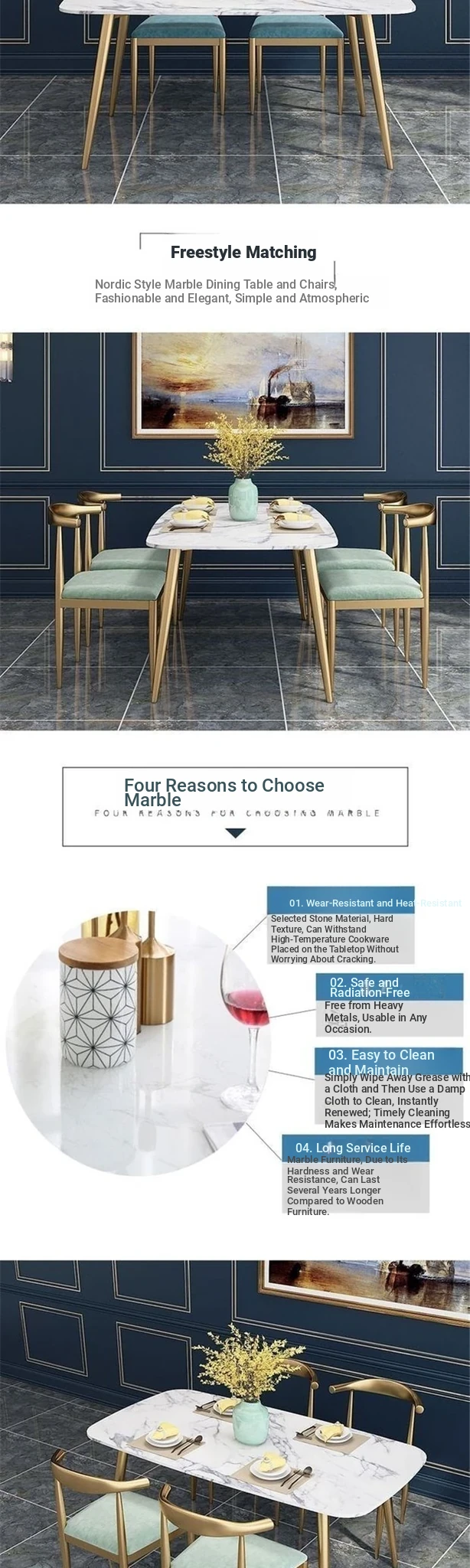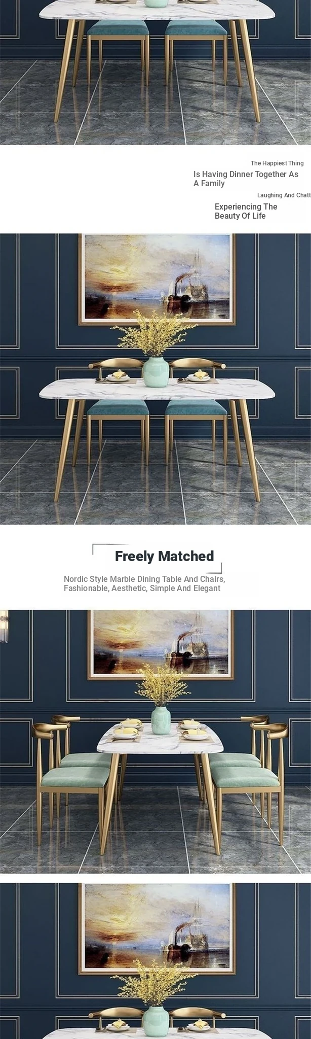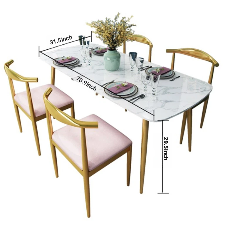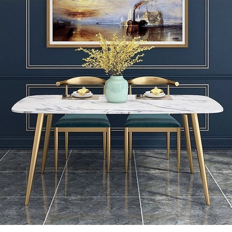 Nordic Minimalist Marble Dining Table for Small Spaces - Elegant Rectangular Table with Iron Gold Accents & Luxurious Horn Chairs for Home Use