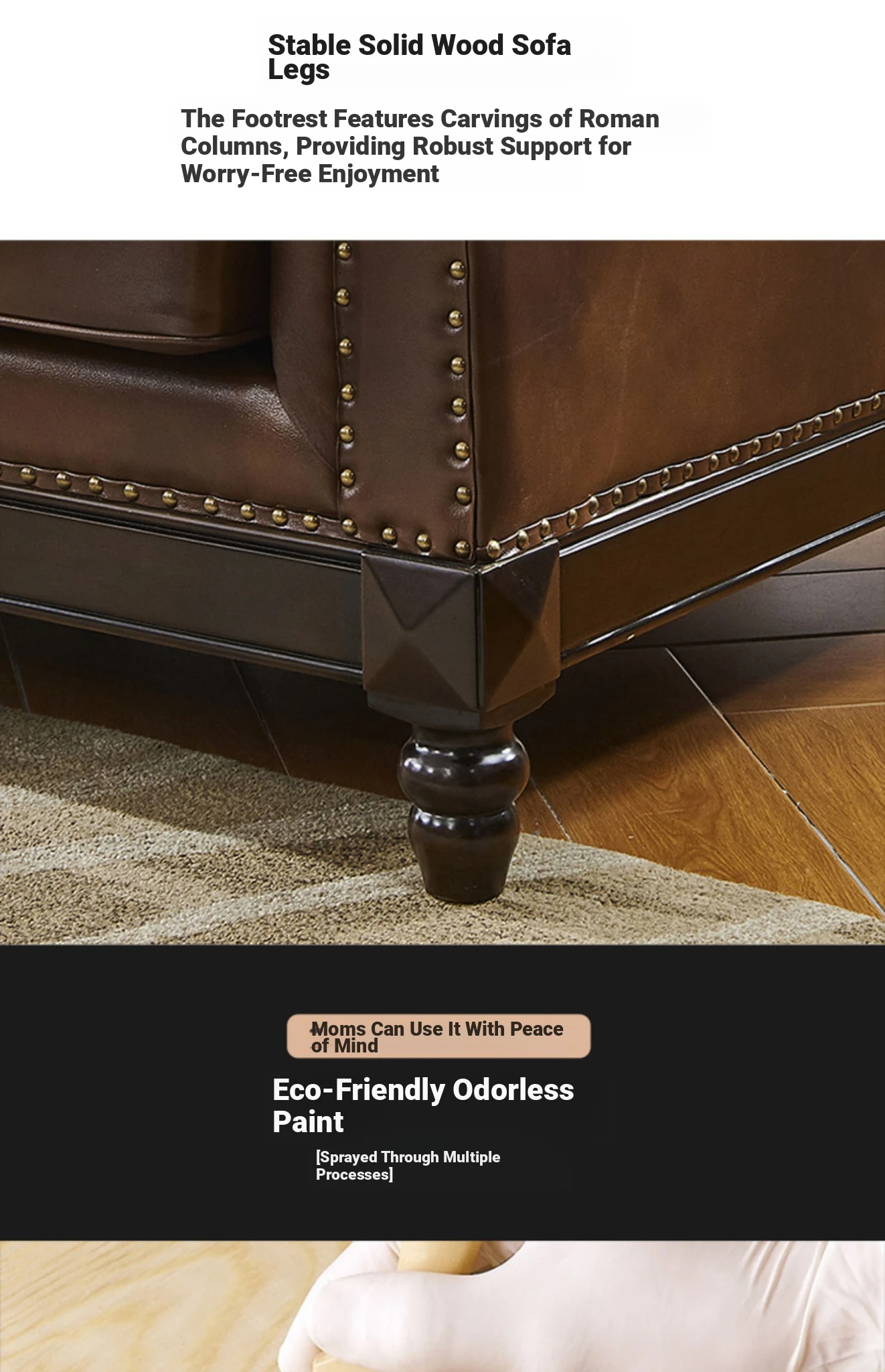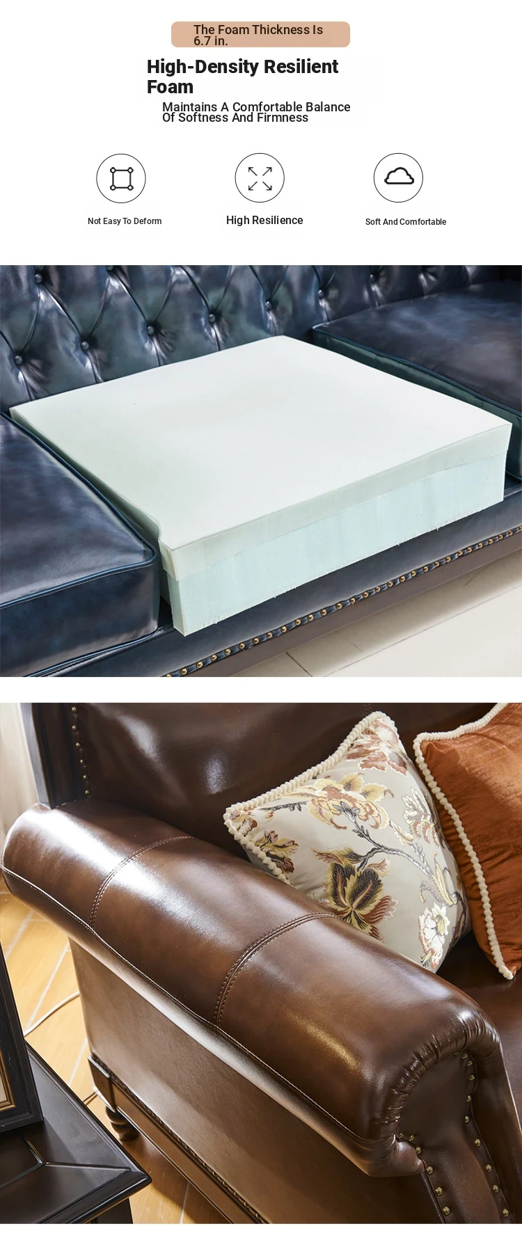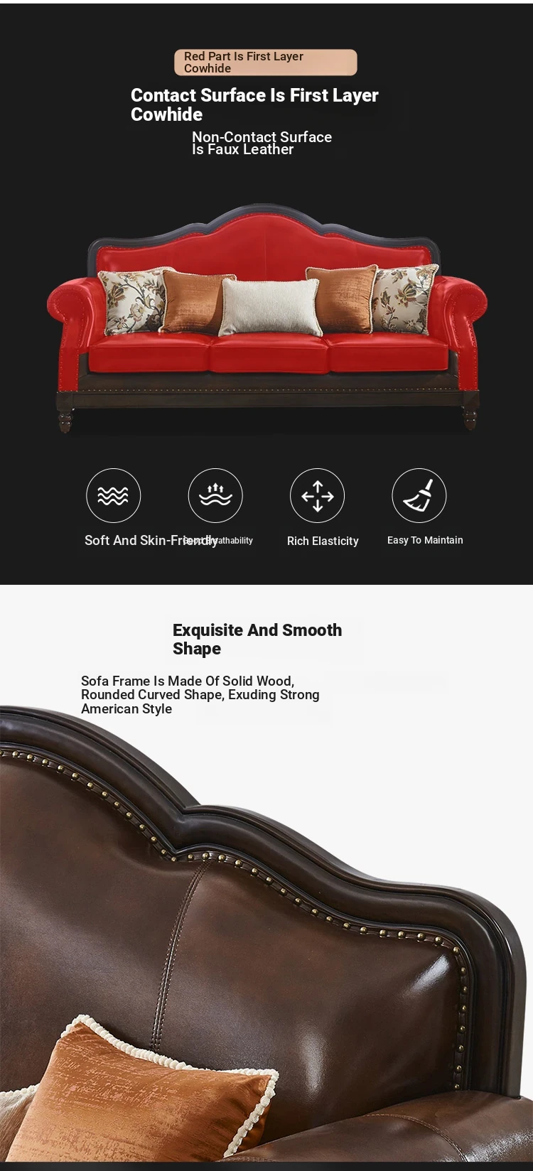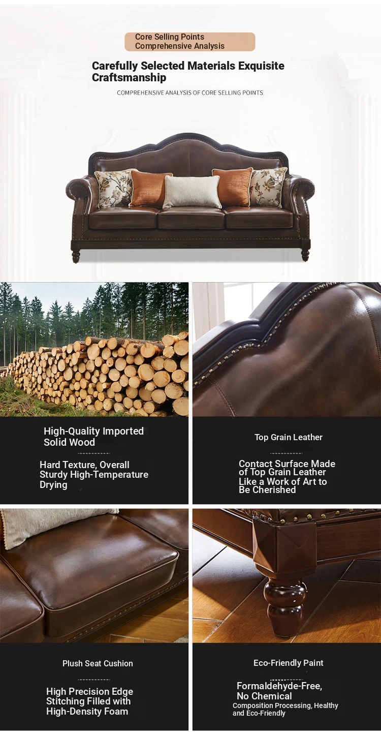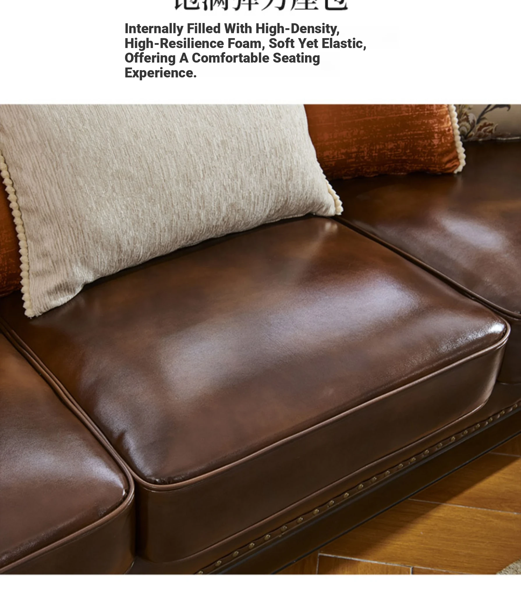 American Style Genuine Leather Solid Wood Sofa Set for Large Living Rooms - Premium Top-Grain Cowhide 123 Combination in Deep Brown - Perfect for a Luxurious and Comfortable Home Decor