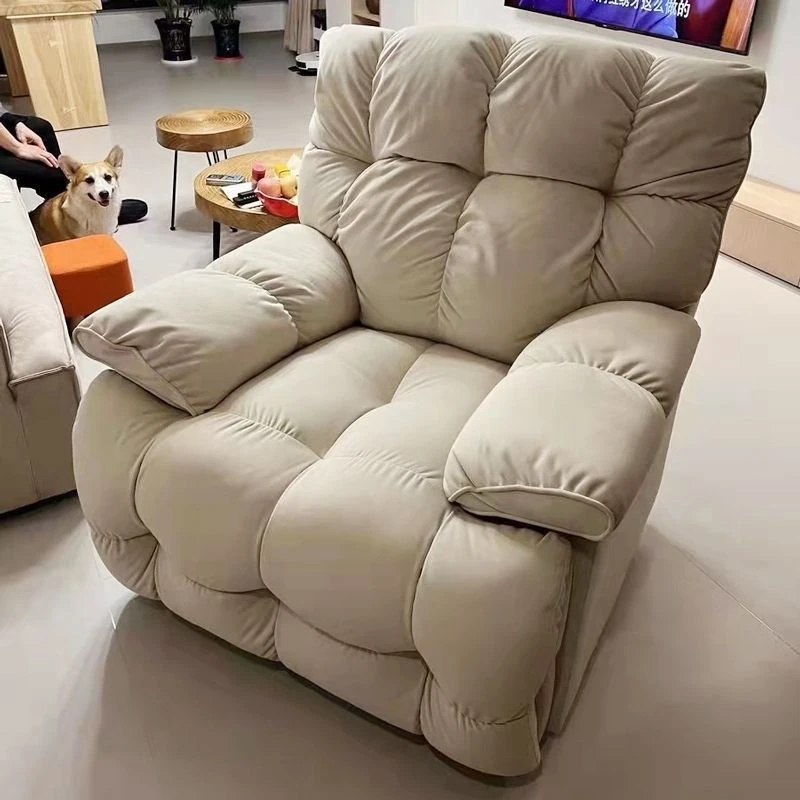 クリーム色の一人用ソファチェア - くつろげるリクライニング機能付き!リビングや寝室にぴったりの揺れるハンモック型ソファ。まるで宇宙船のようなデザインで、あなたのリラックスタイムを特別に演出します!多機能で快適なひとときをお楽しみください。