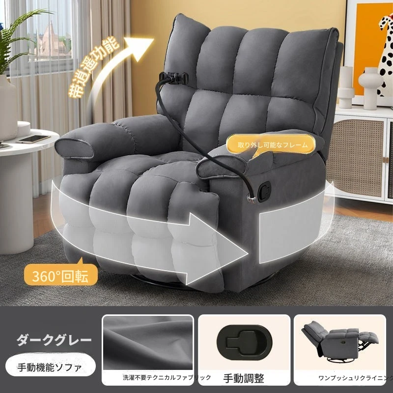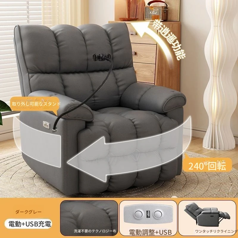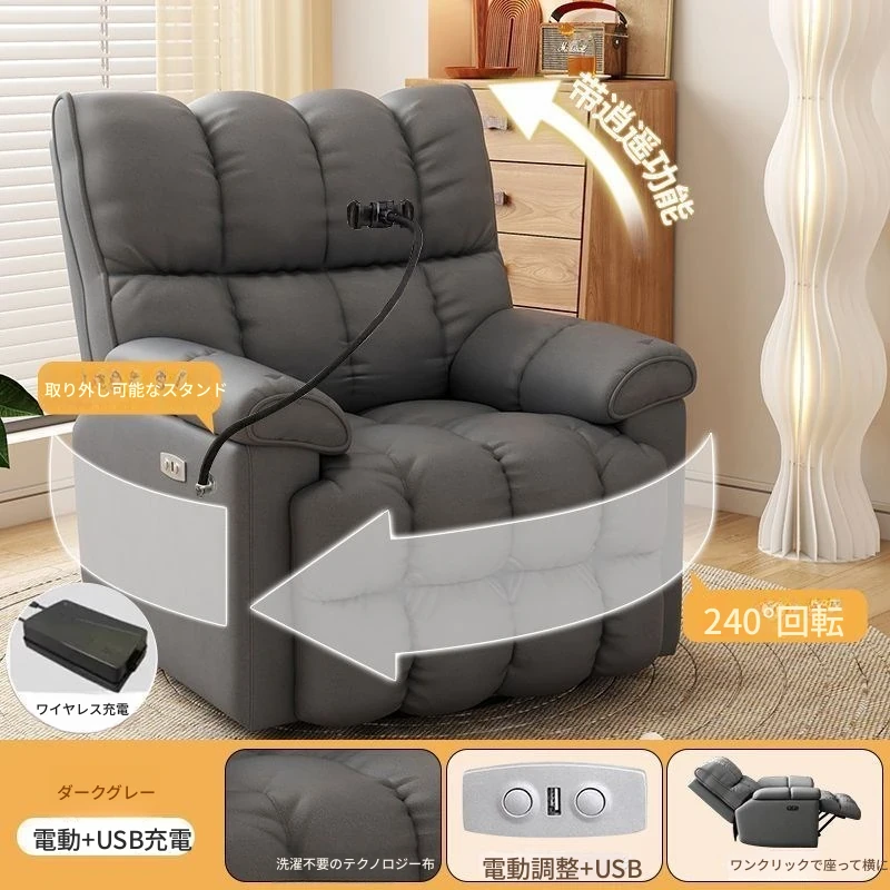 【テクノロジー布】ダークグレー(ラテックスタイプ)_モデル(電動リクライニング回転無線充電スマホスタンド+USB)