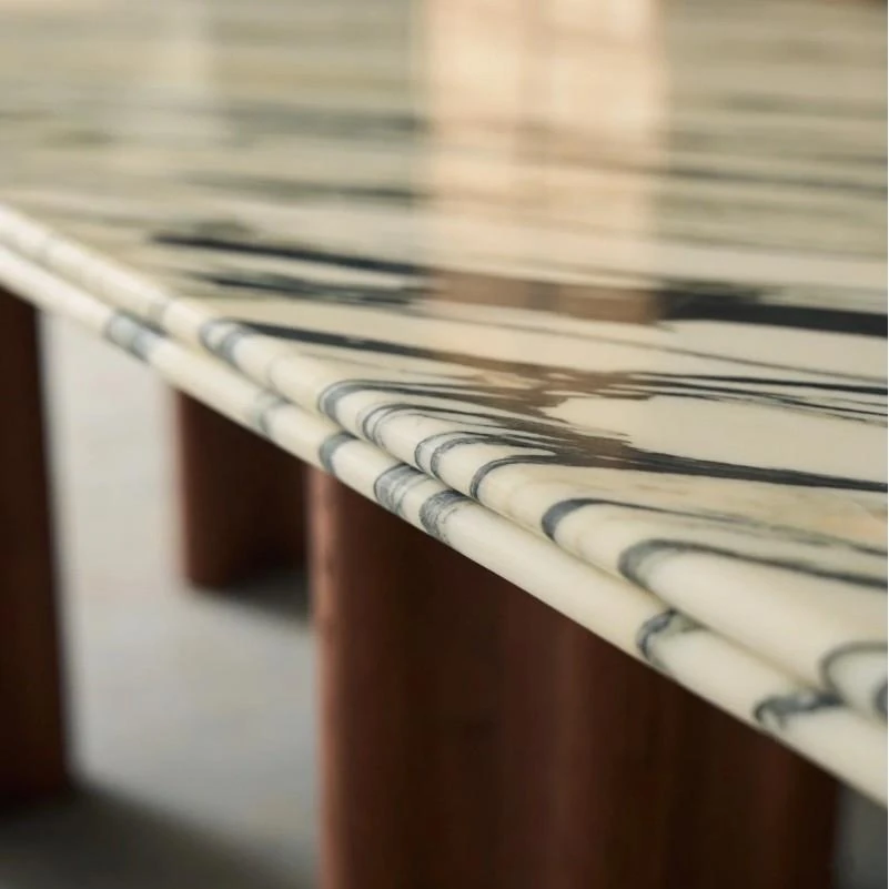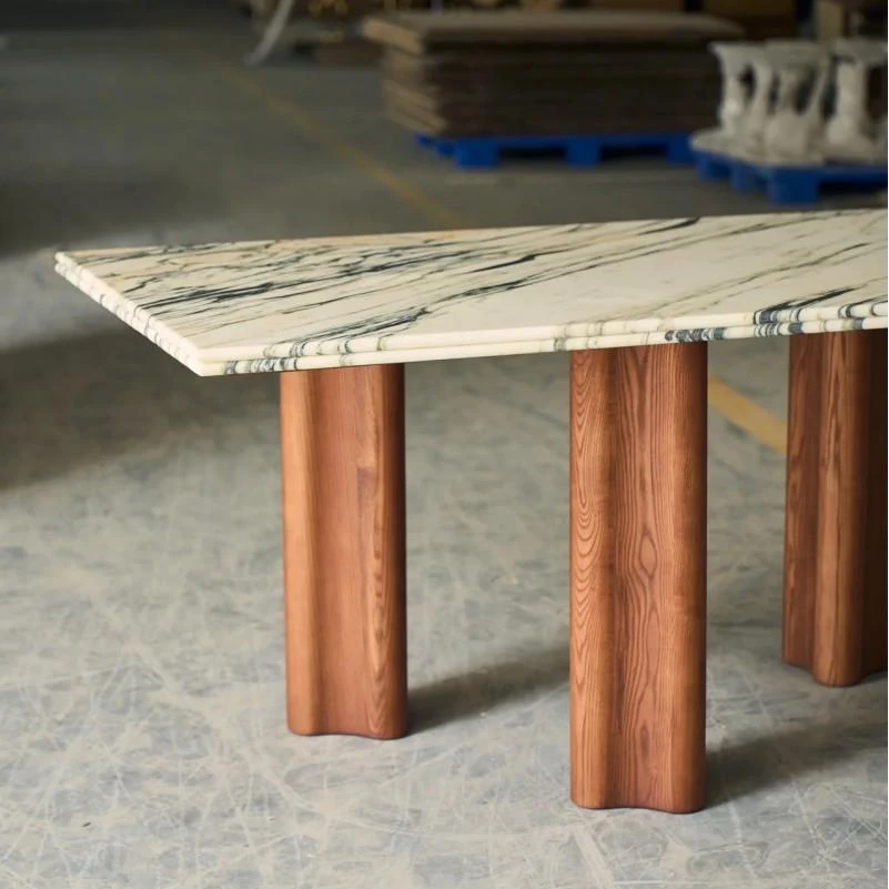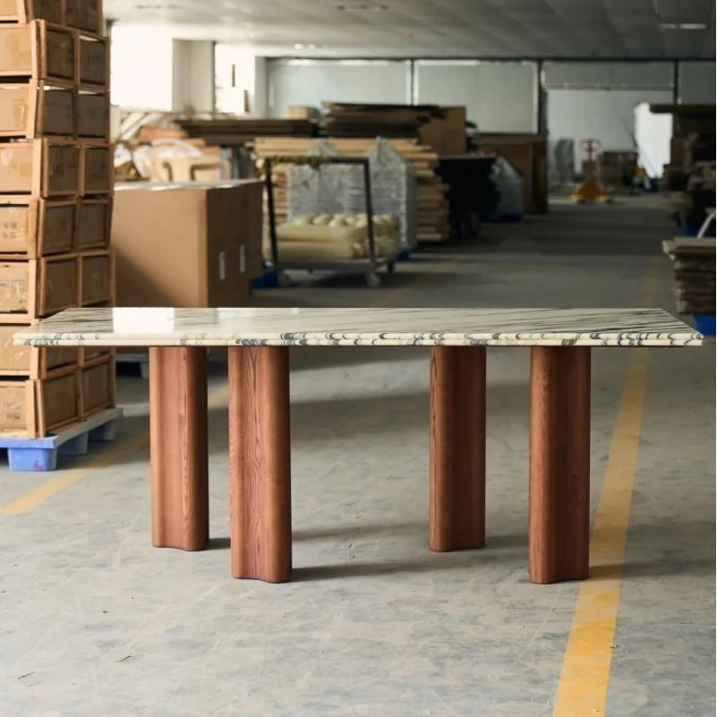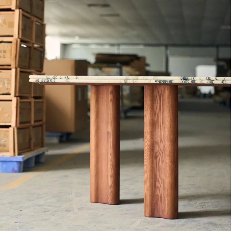 レトロな大理石デザインの長方形ダイニングテーブル - 高級感あふれる天然木製、侘寂風スタイルのインテリアにぴったりな一品!家族や友人との食事を特別な時間に演出します。