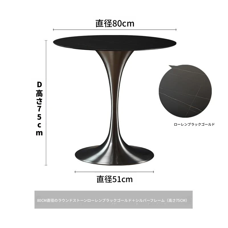 岩板ローランブラックゴールド80直径+シルバー脚 高75cm 天板に模様あり