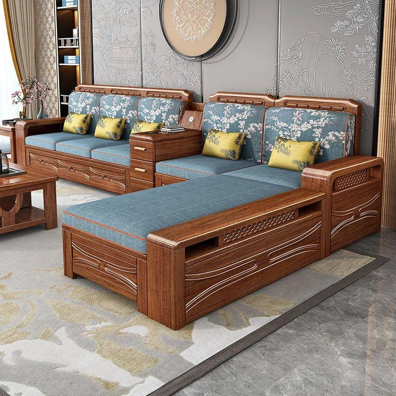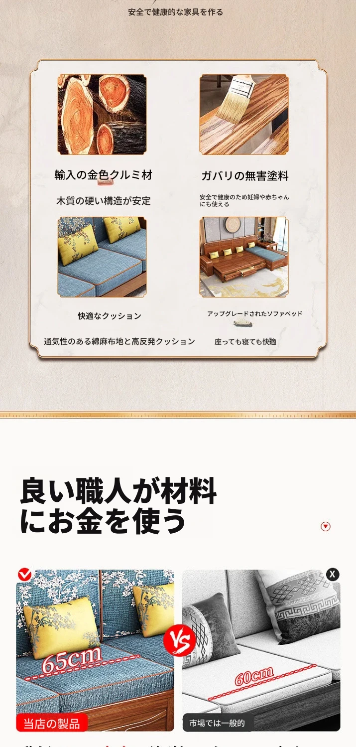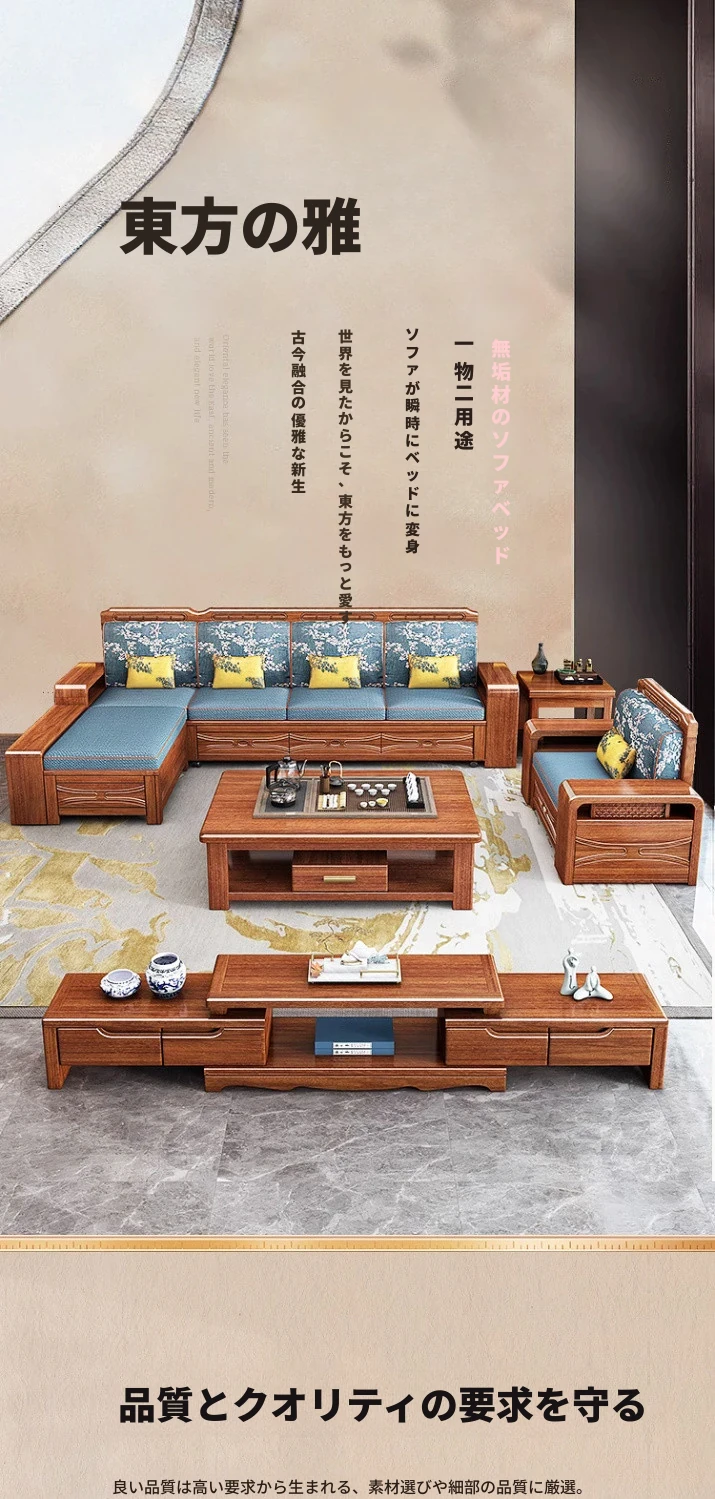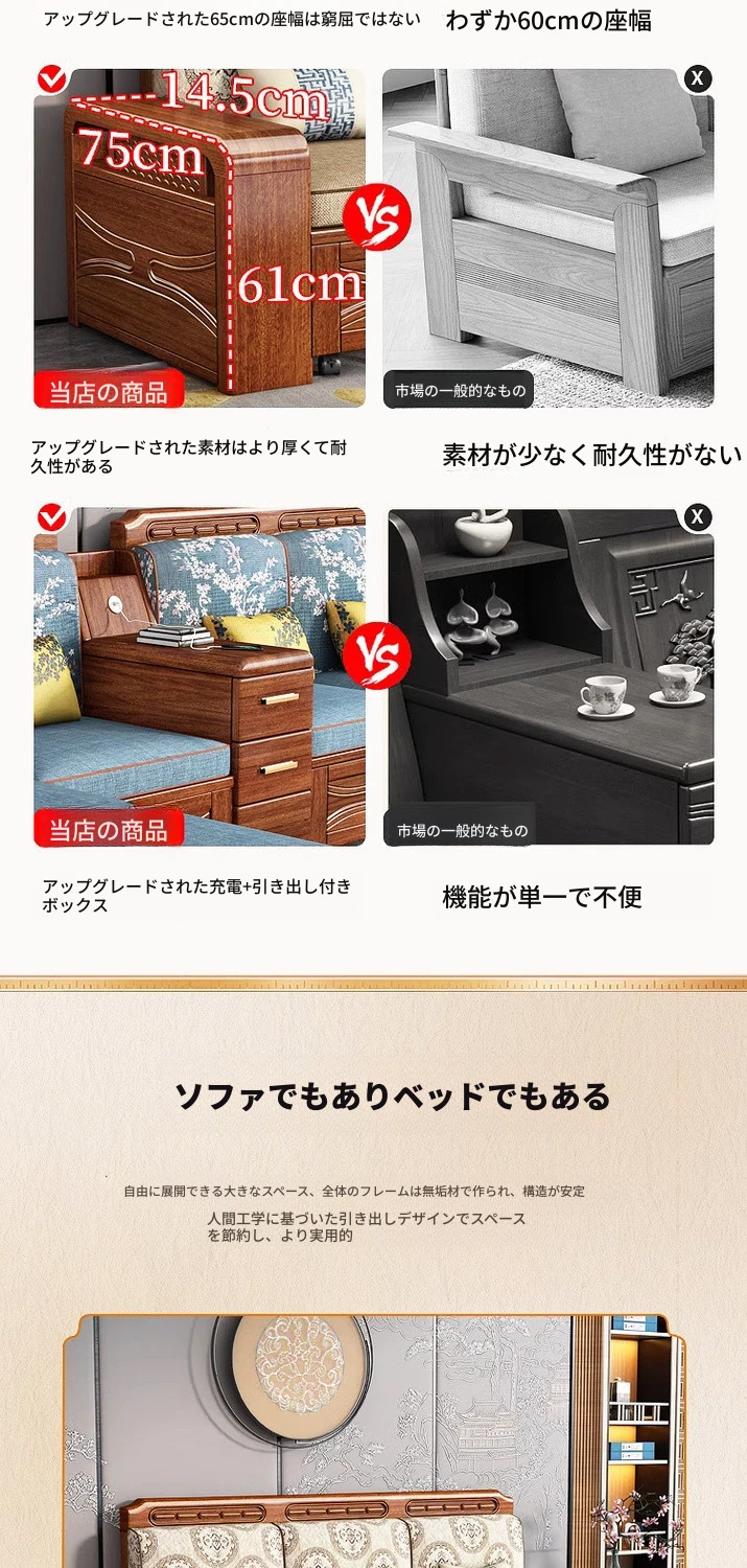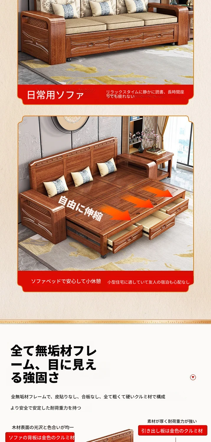 dWOMnのクルミ無垢材ソファベッド - スタイリッシュな折りたたみデザインで、収納力抜群の多機能ソファ!彫刻装飾でお部屋に高級感をプラス。リビングやホールに最適な一体型の実用的なアイテムです。