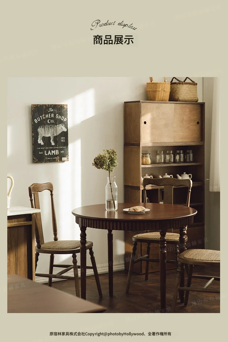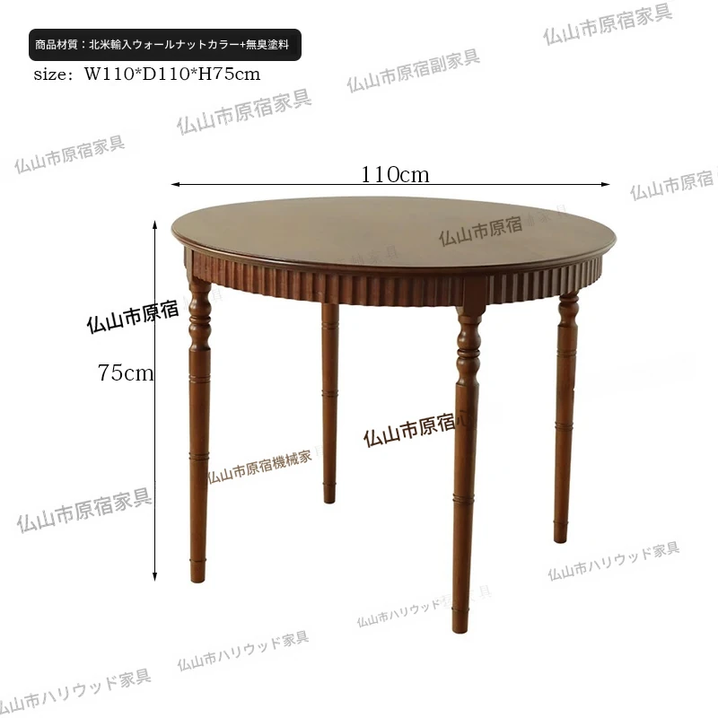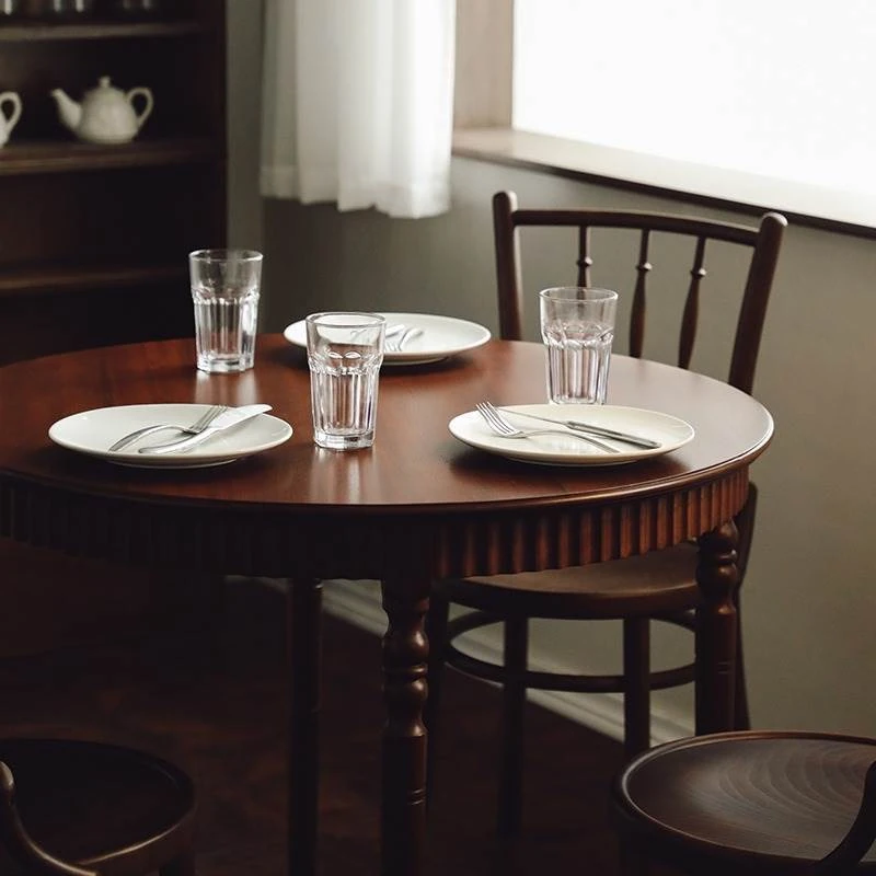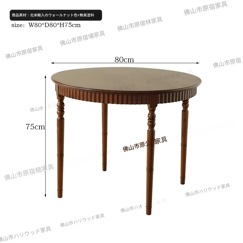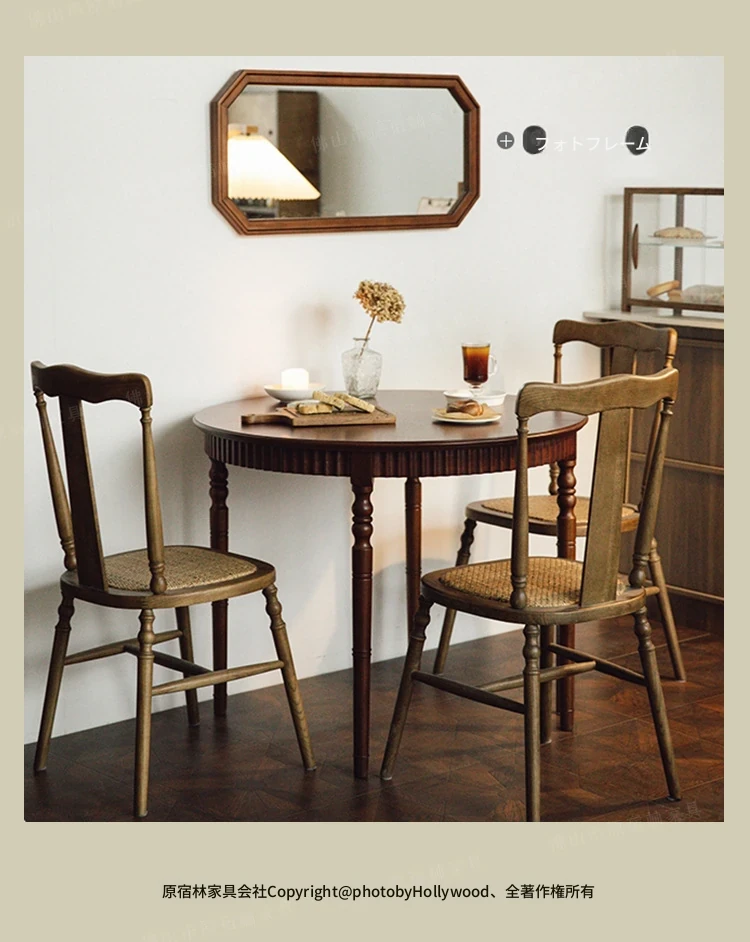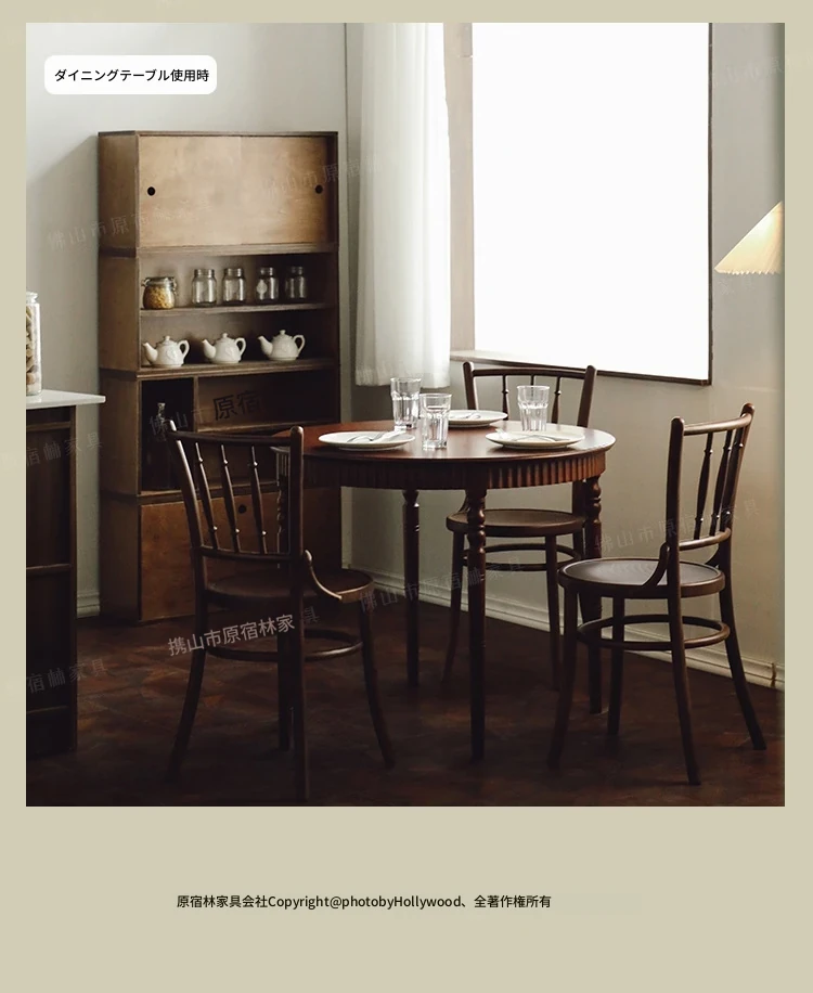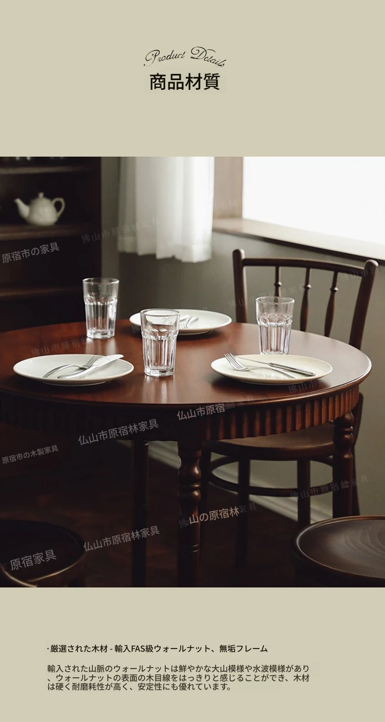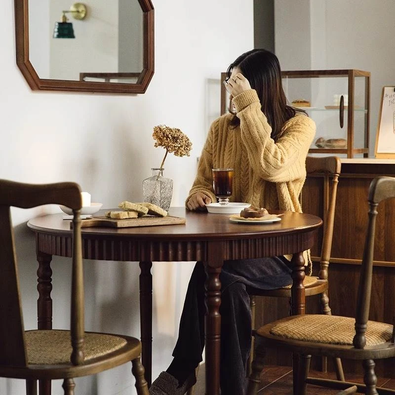 おしゃれな丸テーブル!小さなスペースにぴったりなフレンチスタイルの中古無垢材ダイニングテーブルと椅子セット。ウォールナットの美しい家具で、心地よいカフェ空間を演出します。