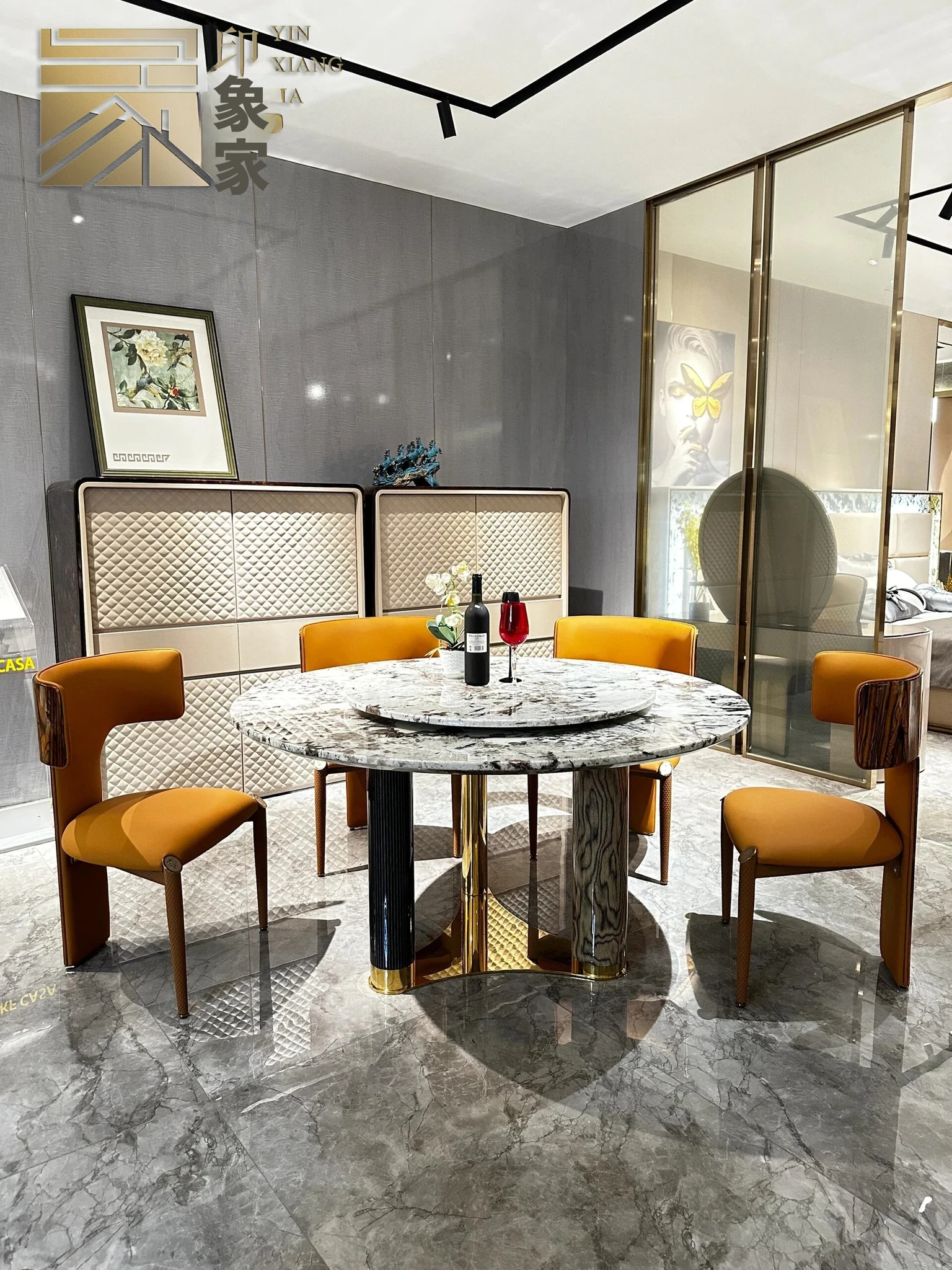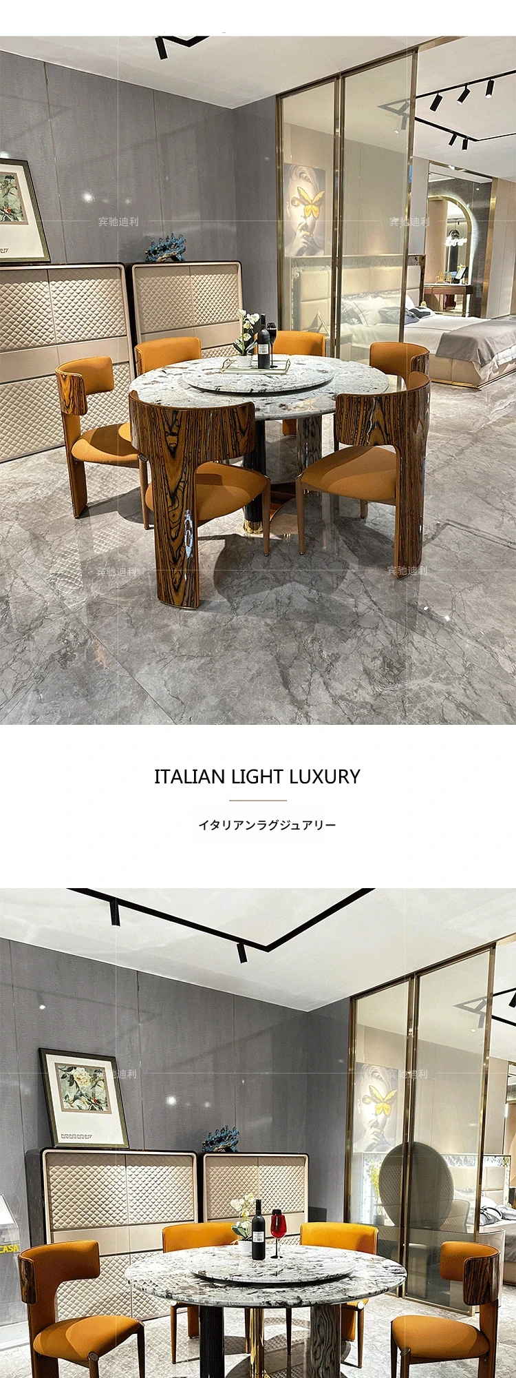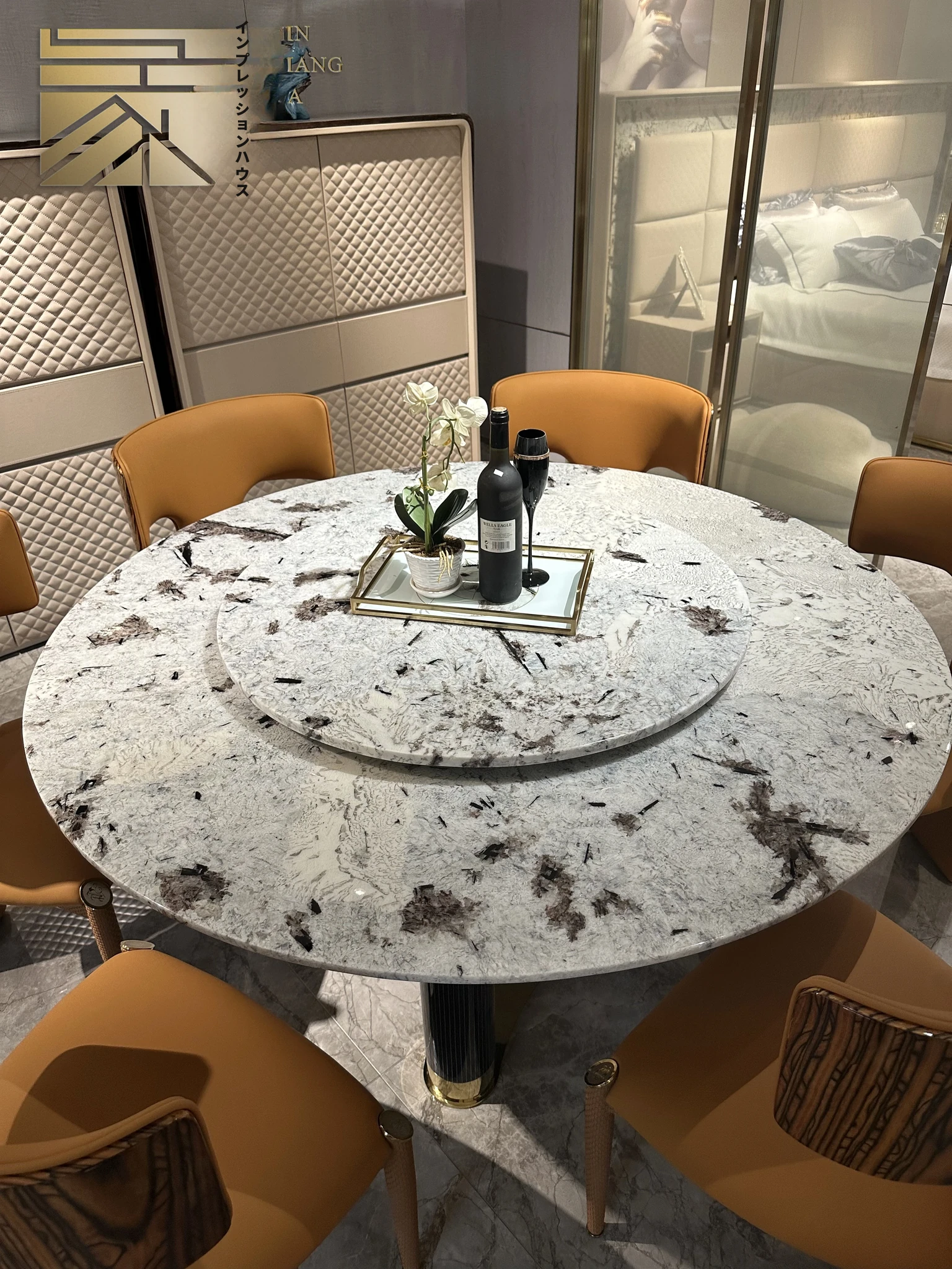 イタリア産天然大理石使用のラグジュアリーなダイニングテーブル&チェアセット。モダンな高級感あふれる円形デザインで、別荘や豪華な家にぴったり。快適な食事体験を提供します。
