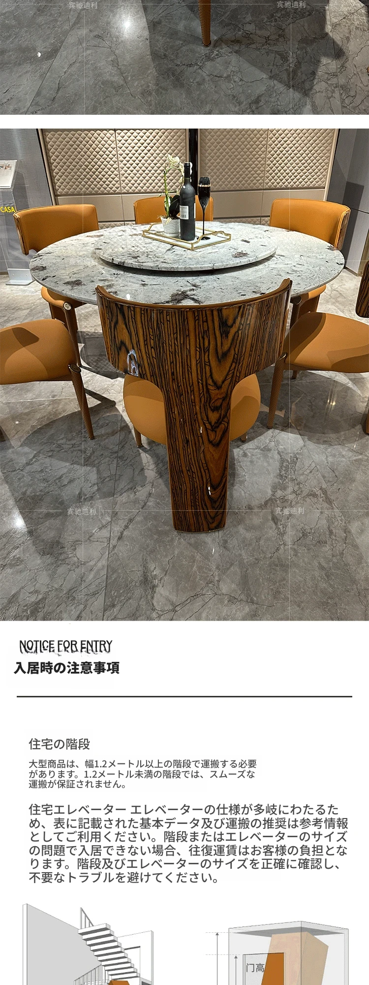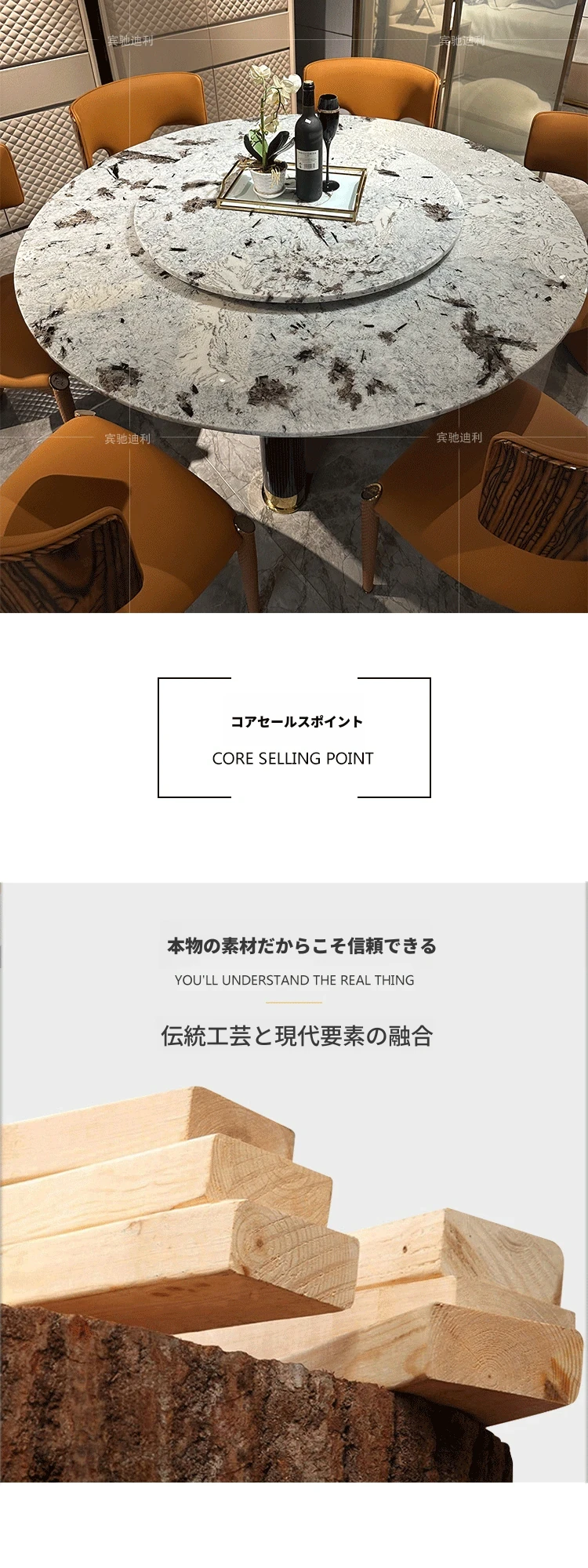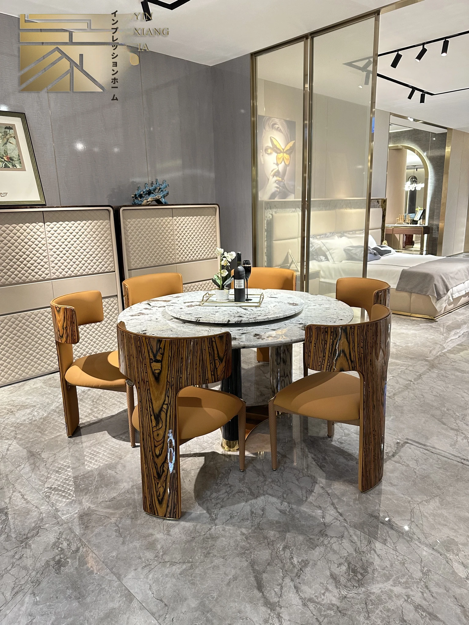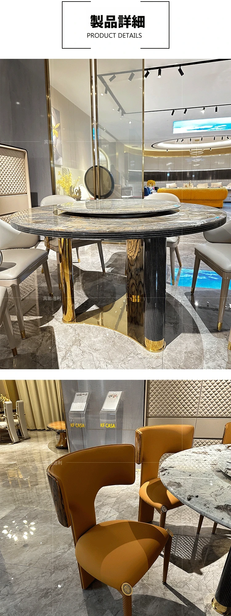 イタリア産天然大理石使用のラグジュアリーなダイニングテーブル&チェアセット。モダンな高級感あふれる円形デザインで、別荘や豪華な家にぴったり。快適な食事体験を提供します。