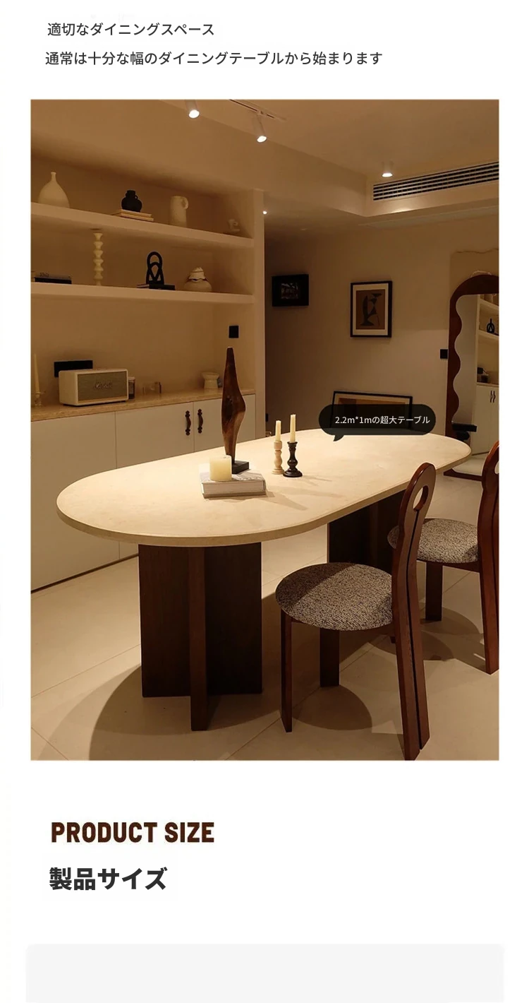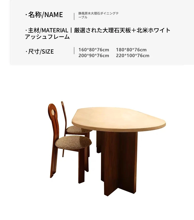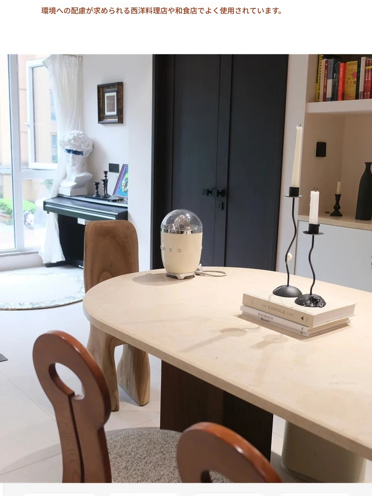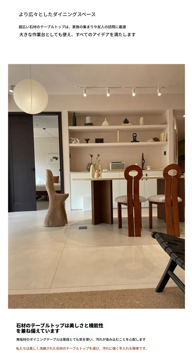 洞石大理石と本格的な木材を使用した日本式のダイニングテーブル。全てが無垢材で作られた、アンティークな侘寂スタイルとフレンチクリーム風のデザインが魅力。おしゃれで心地よい食卓を演出します!