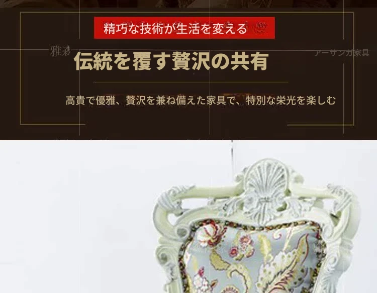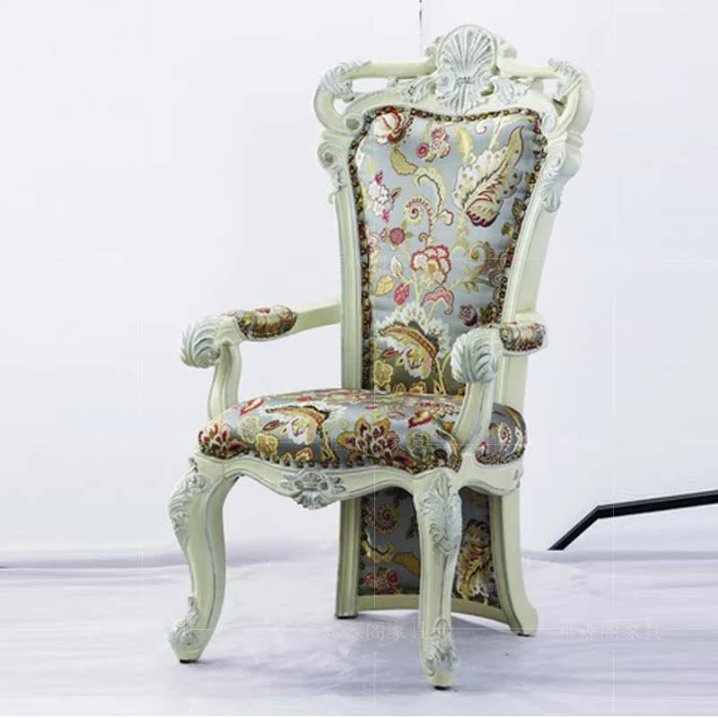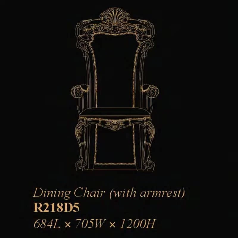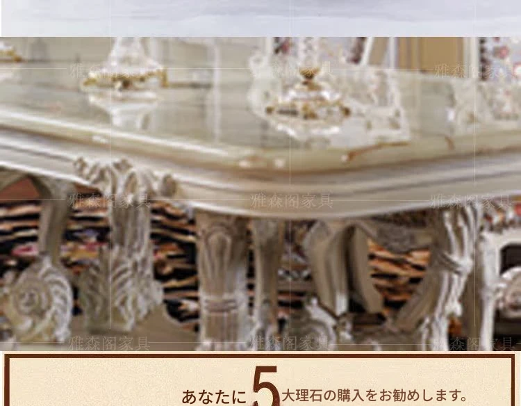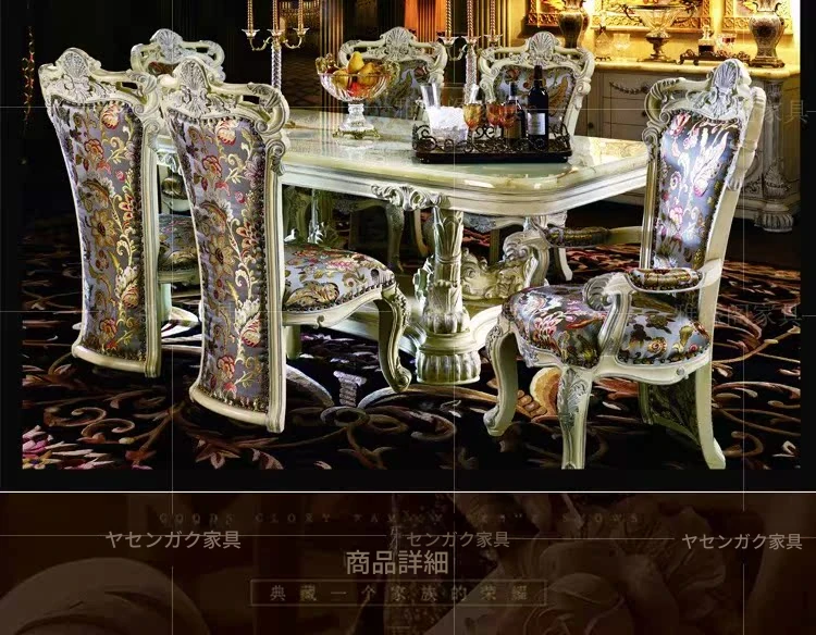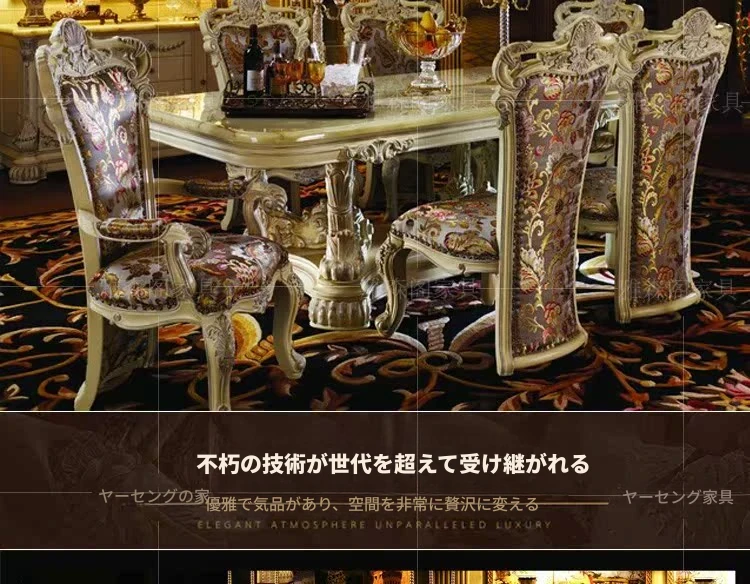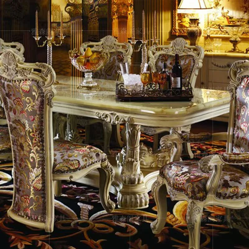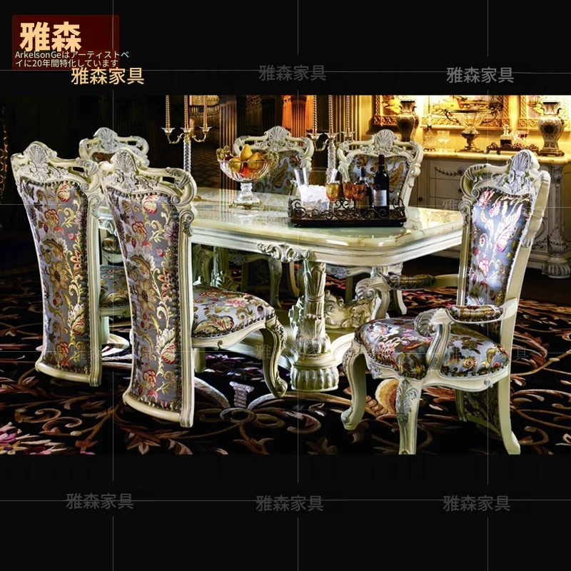 豪華なヨーロピアンスタイルの手作り彫刻ヴィラ用ロングダイニングテーブル - フランス風大理石天板、スタイリッシュなアームレスチェア付き!食事を楽しむための贅沢な空間を演出します。