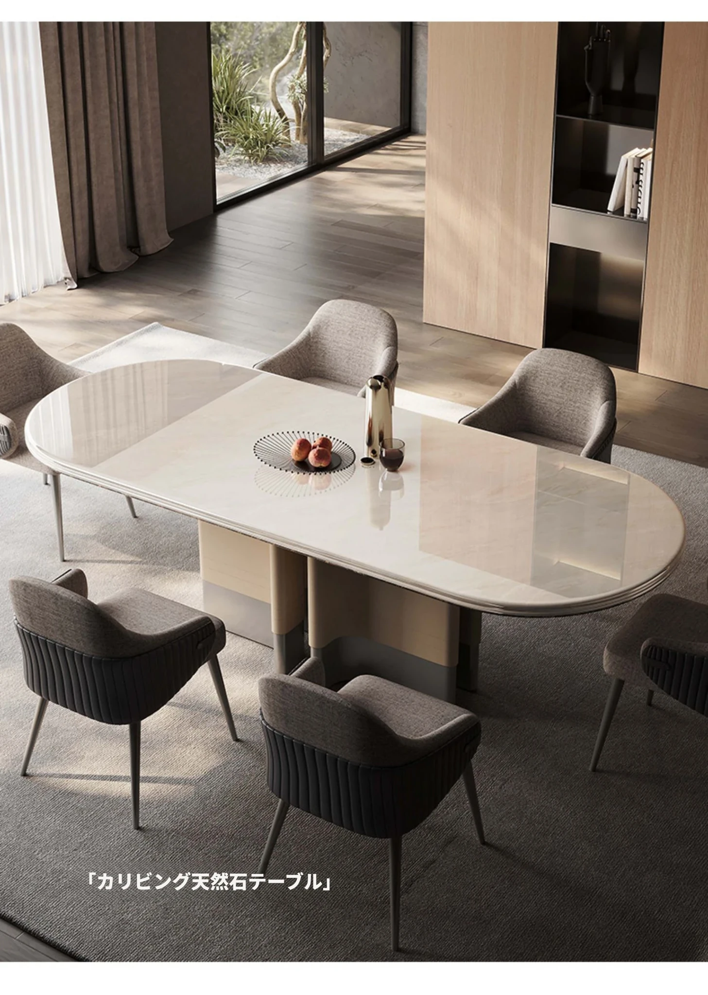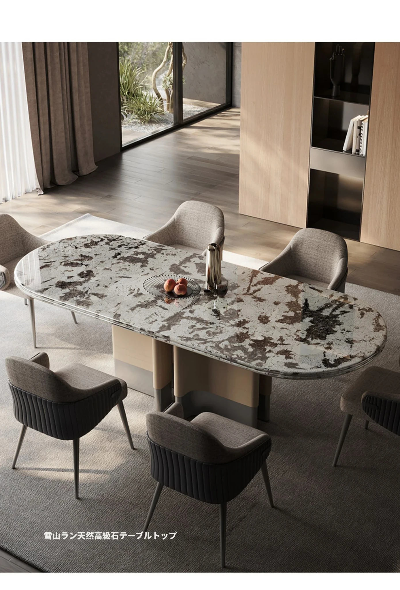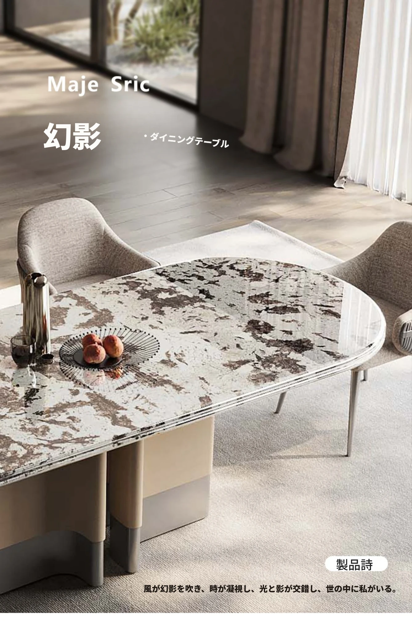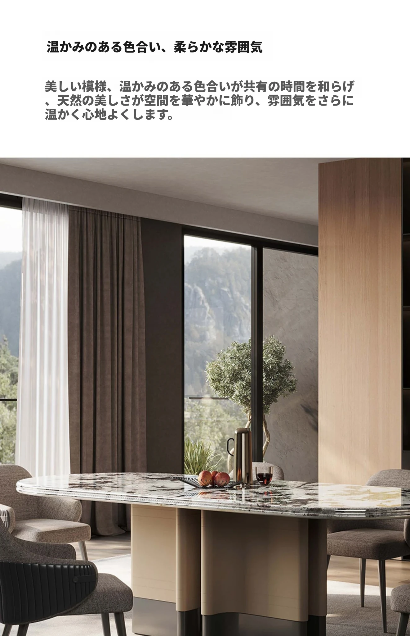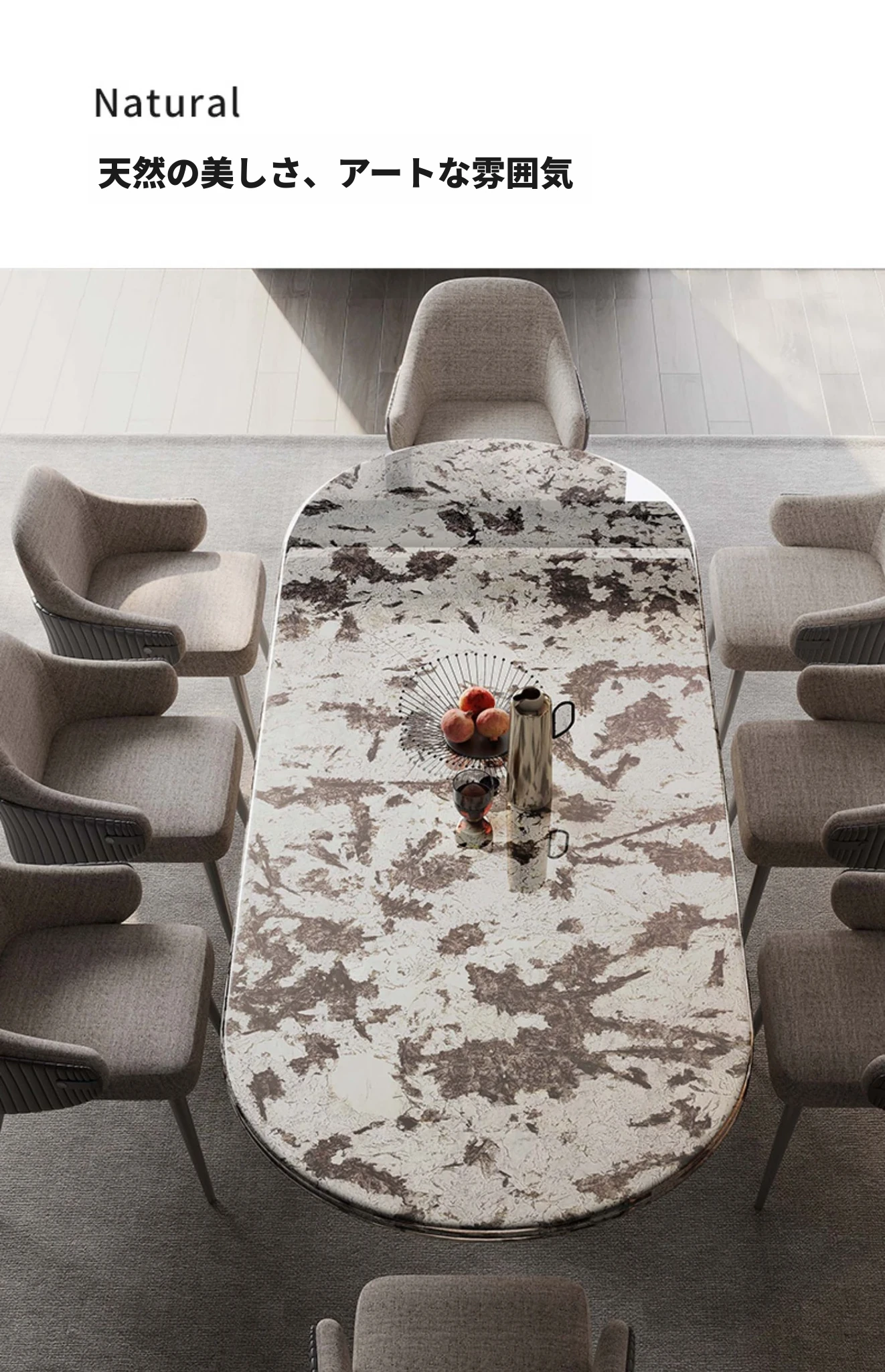 モダンでシンプルなデザインの大理石ダイニングテーブル - 高級感あふれる別荘や広々とした住居に最適な天然雪模様の食卓。家族や友人との特別なひとときを彩ります。