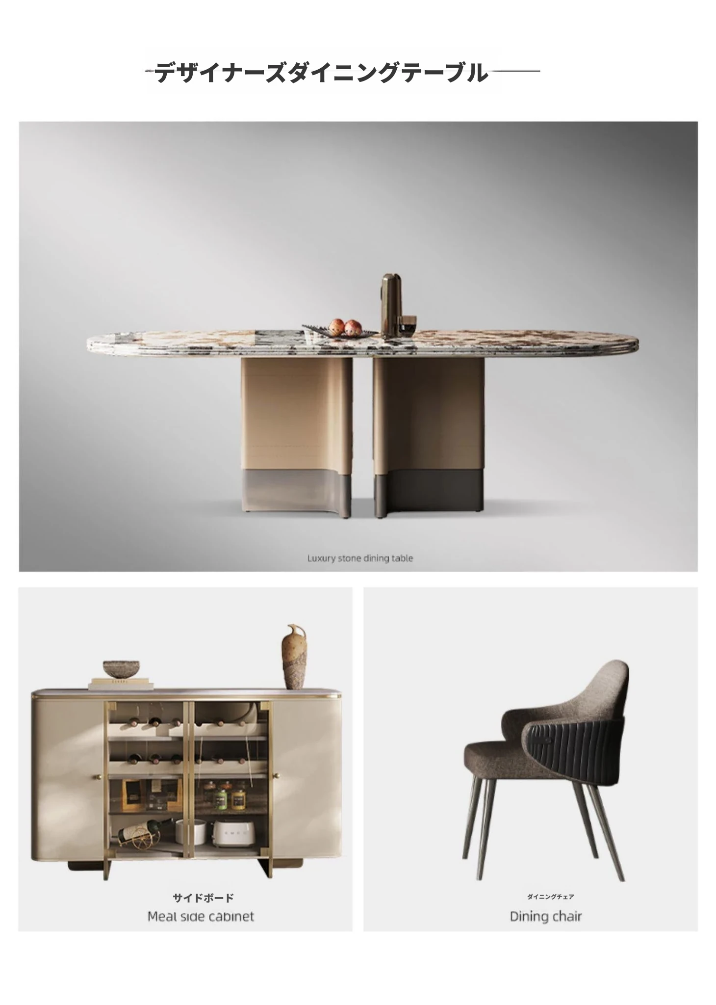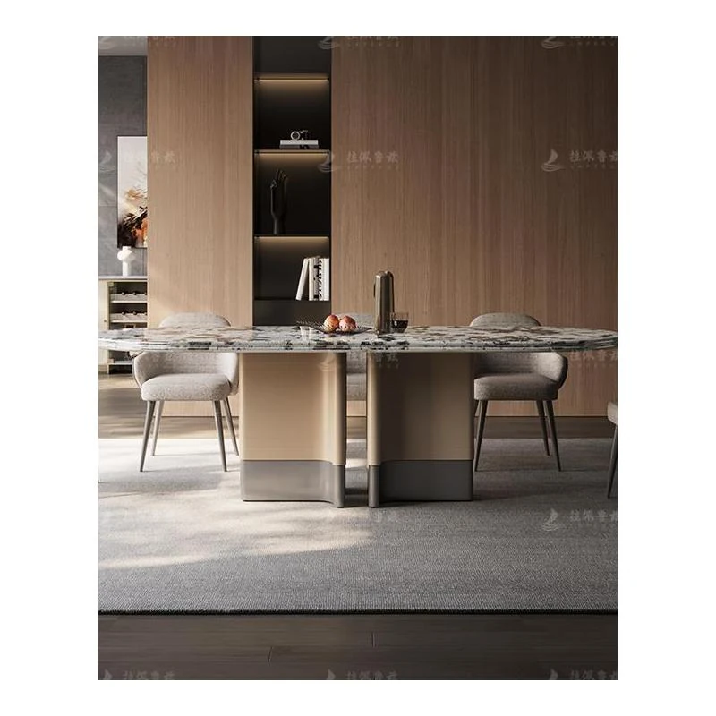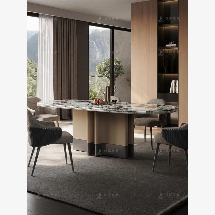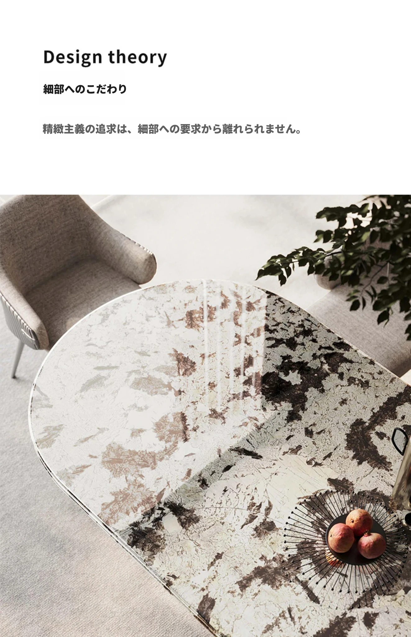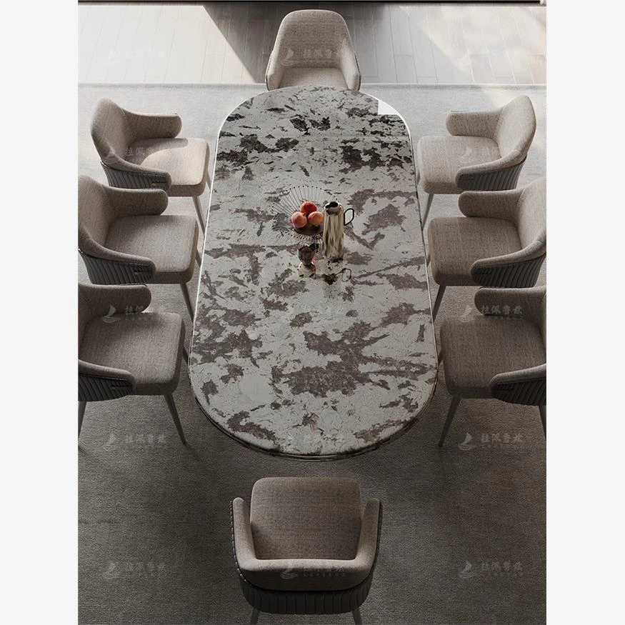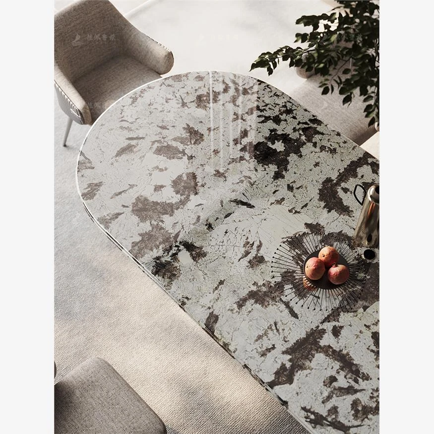 モダンでシンプルなデザインの大理石ダイニングテーブル - 高級感あふれる別荘や広々とした住居に最適な天然雪模様の食卓。家族や友人との特別なひとときを彩ります。
