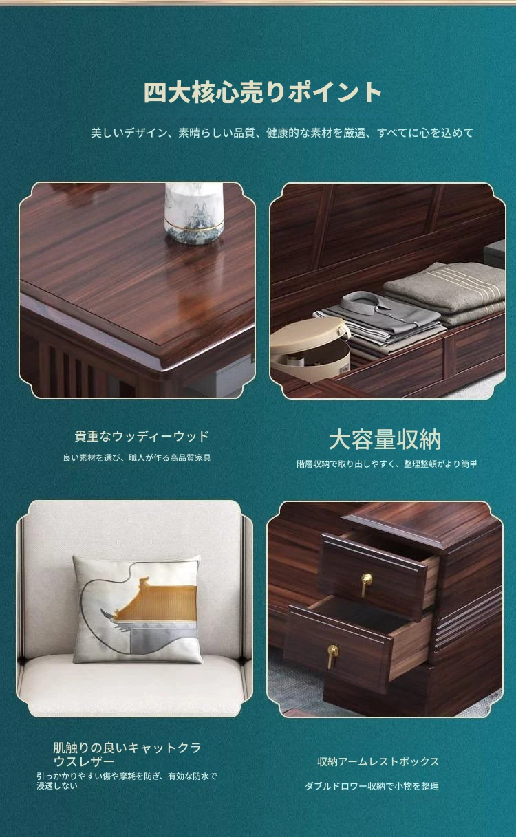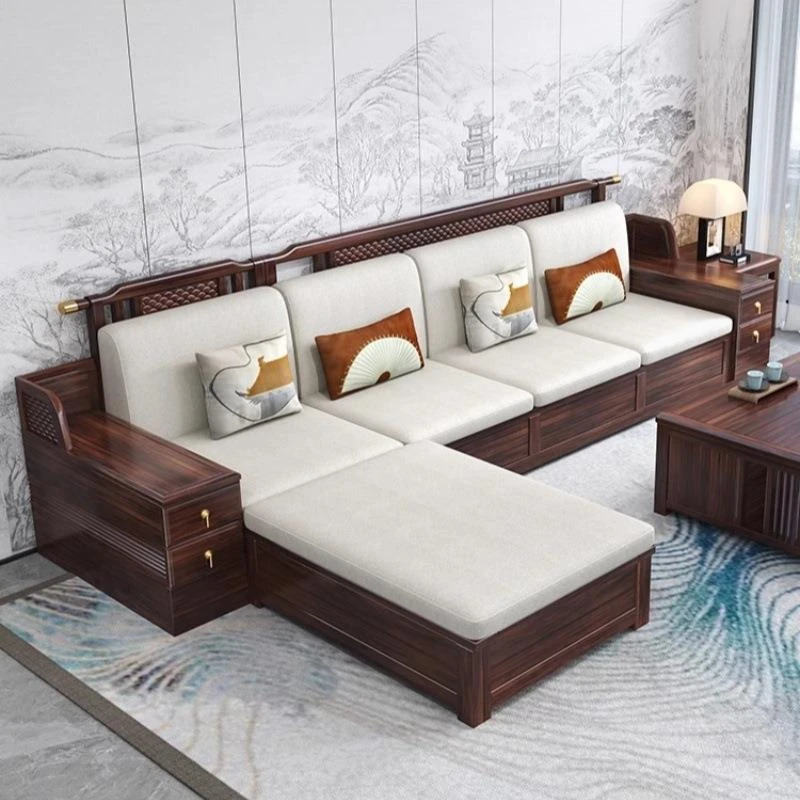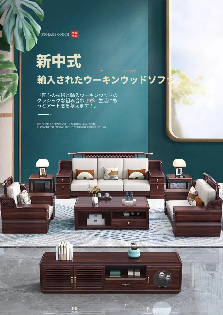 新中式ウッドウーロン木製モダンファミリー用小型実木ソファー、リビングルーム用豪華デザインのロングソファ、メーカー直販でお得!