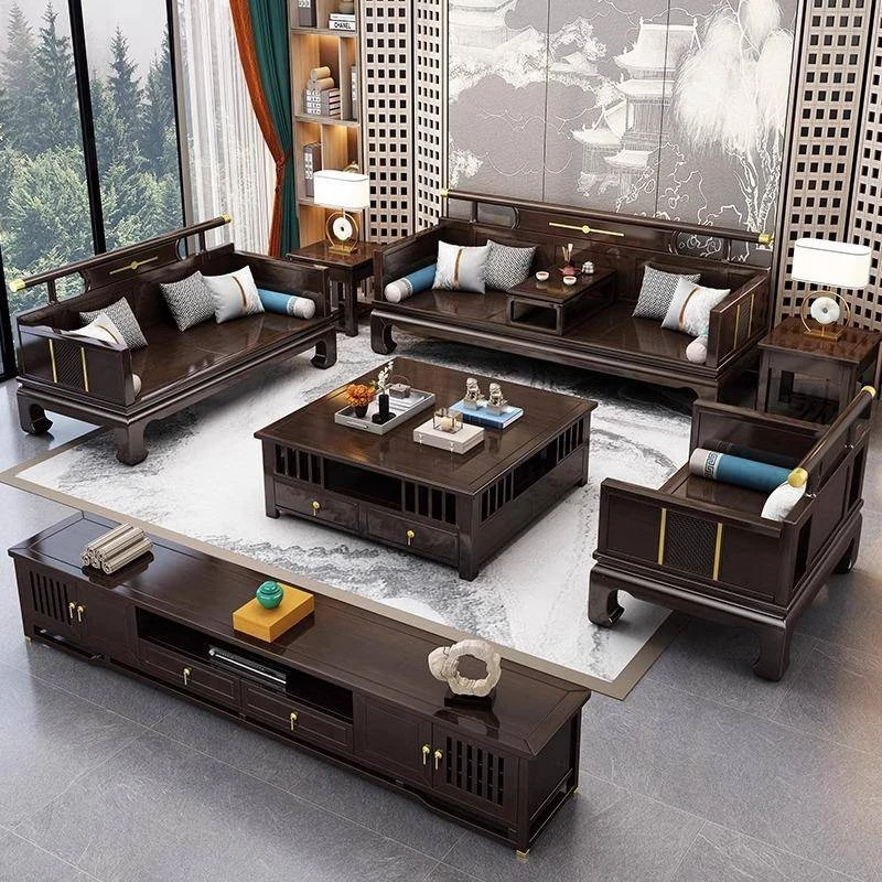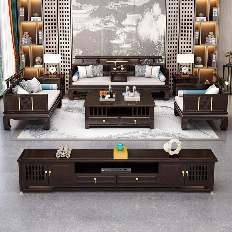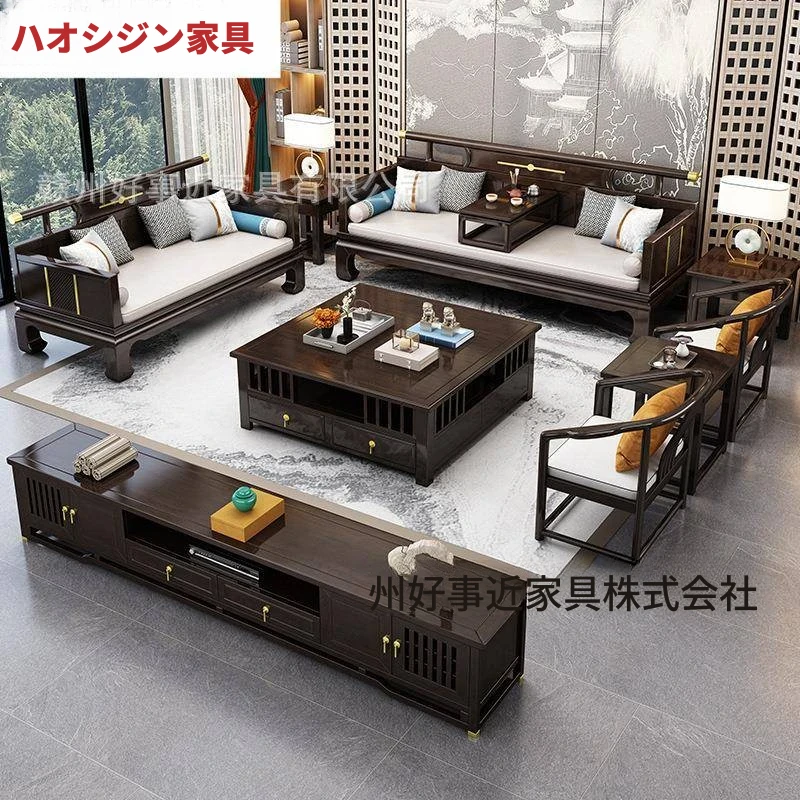 新中式スタイルの無垢材ソファセット - 現代的な中式ヴィラのリビング家具、全てのサイズの住宅にぴったりな禅の雰囲気をお届けします!快適さと美しさを兼ね備えたこのソファで、あなたの空間を特別なものに。