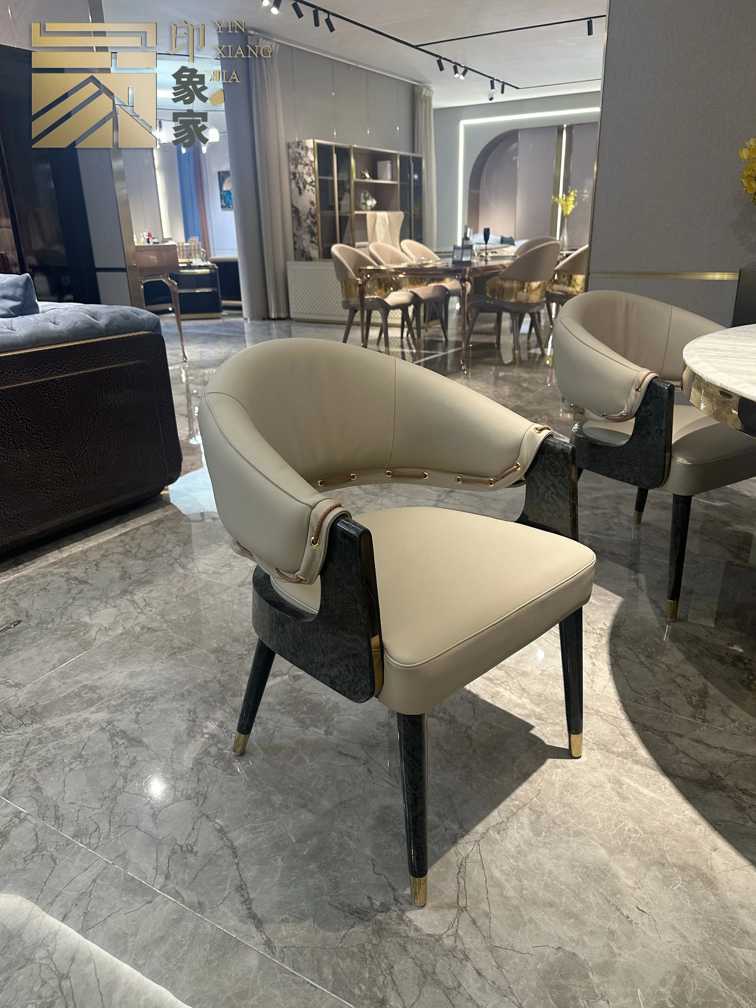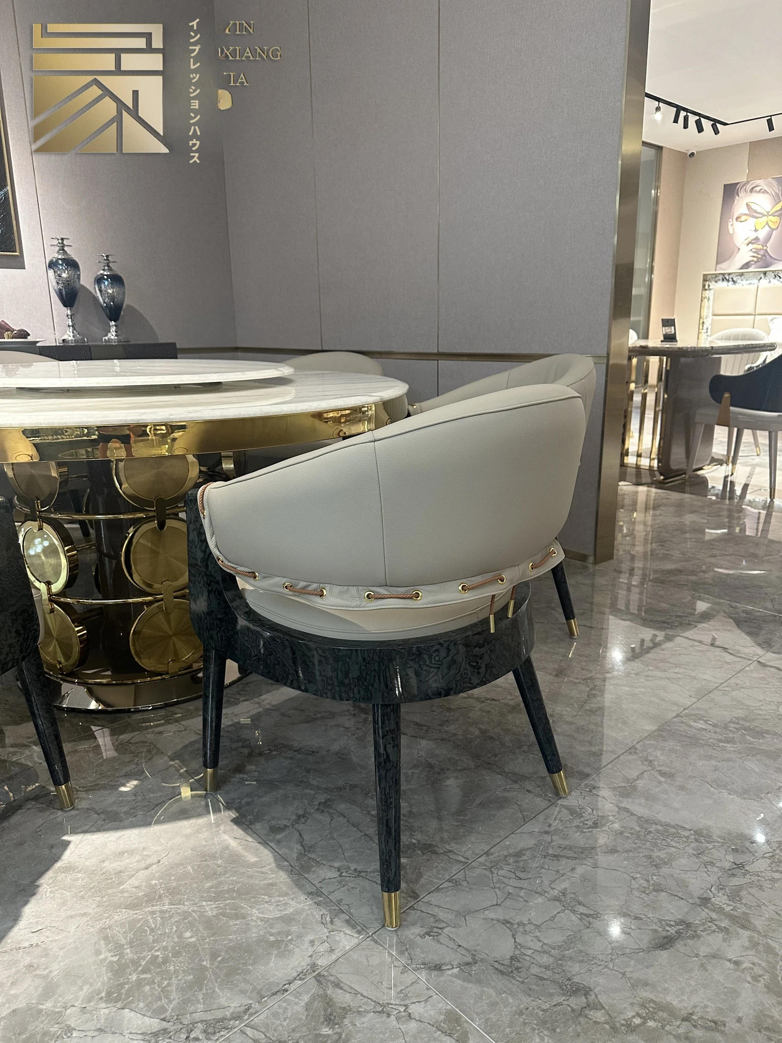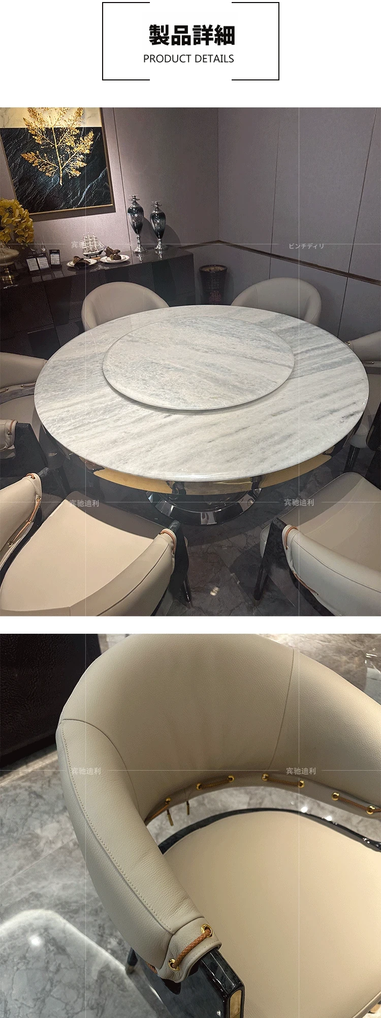 イタリアンモダンステンレススチール大理石ラウンドダイニングテーブル&チェアセット|ラグジュアリーで高級感あふれるデザイン|別荘や広々とした住居に最適な家庭用食卓