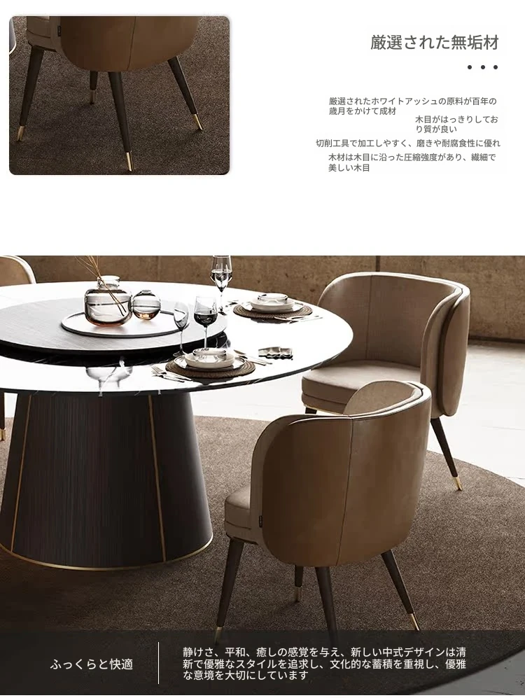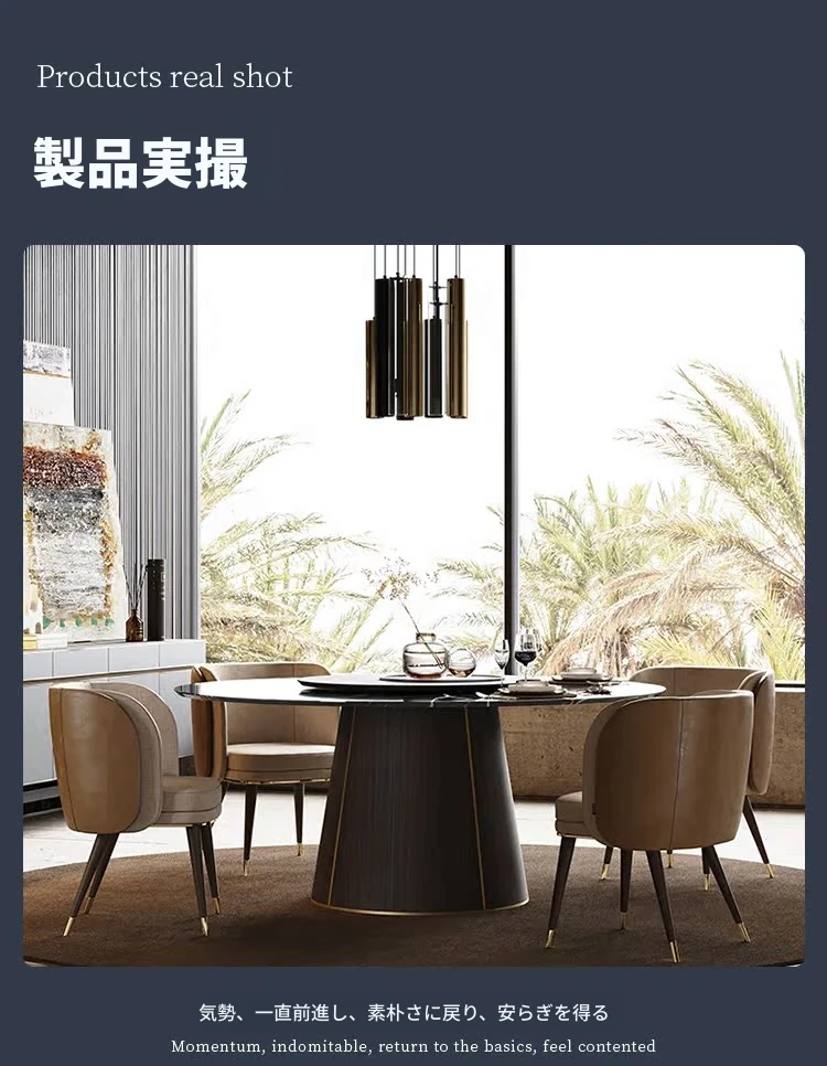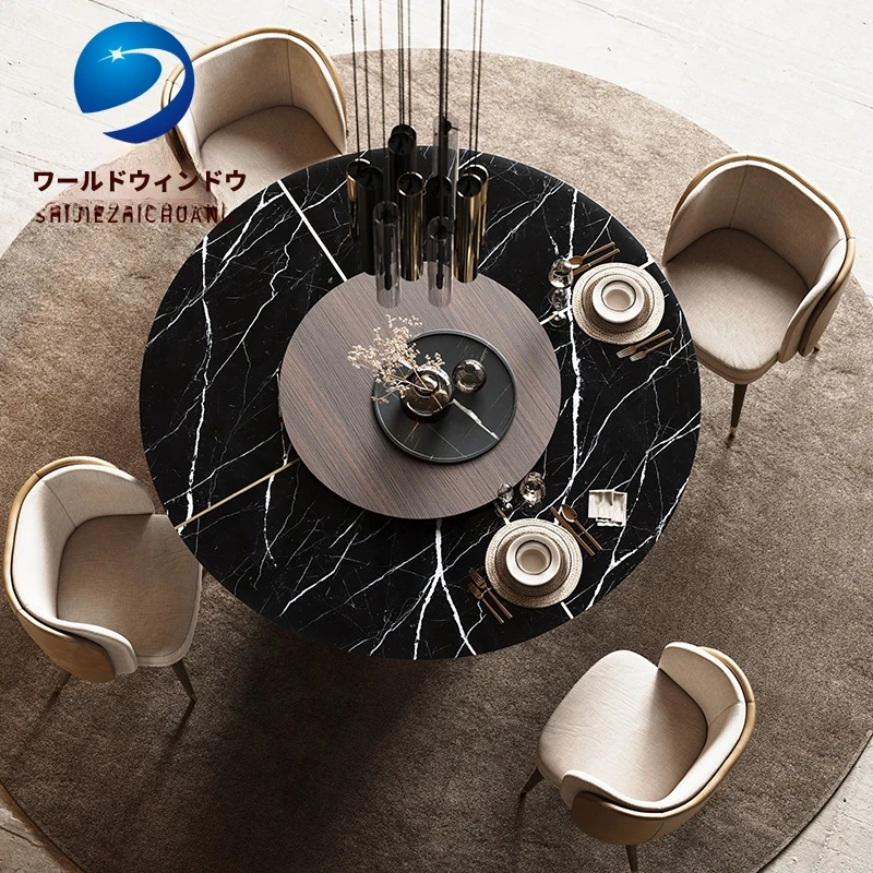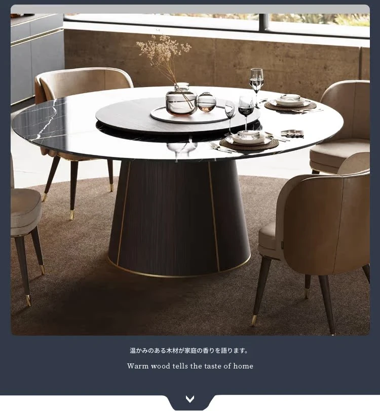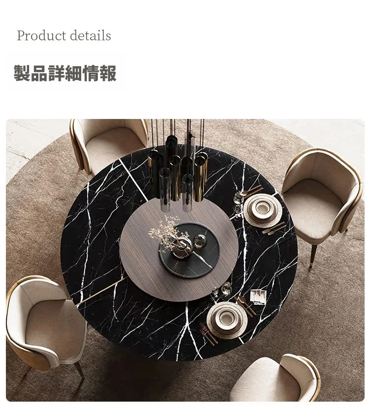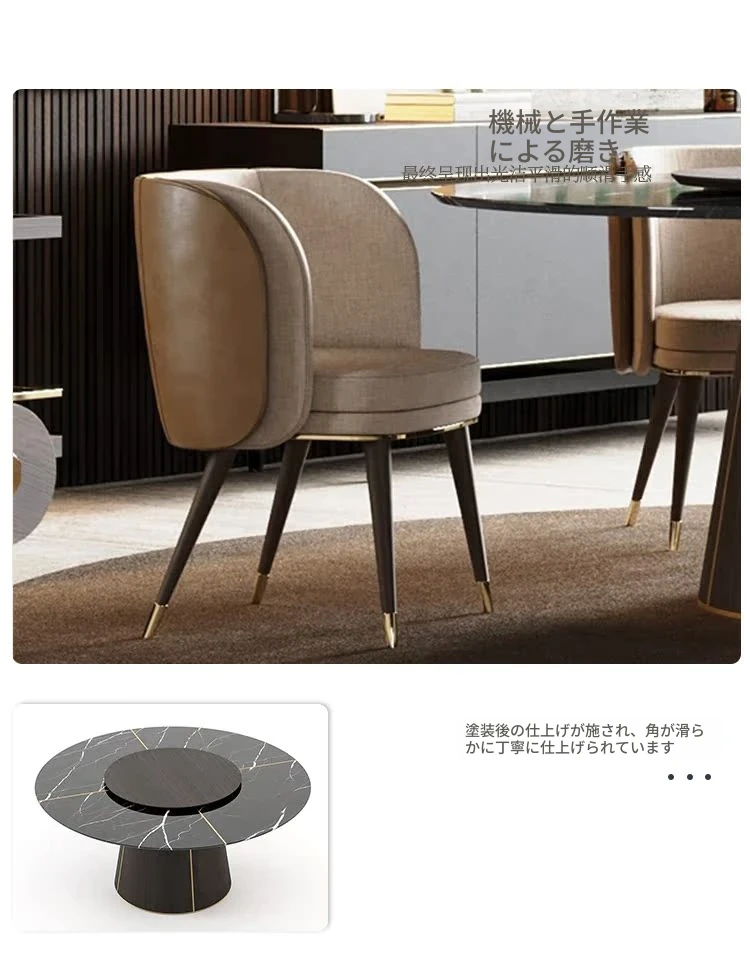 モダンでシンプルなラグジュアリー、天然木と大理石の円形ダイニングテーブル。小さな家でもぴったりのスタイリッシュな食卓。別荘やクラブハウスにも最適な家具です。