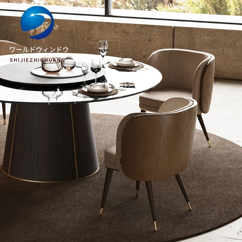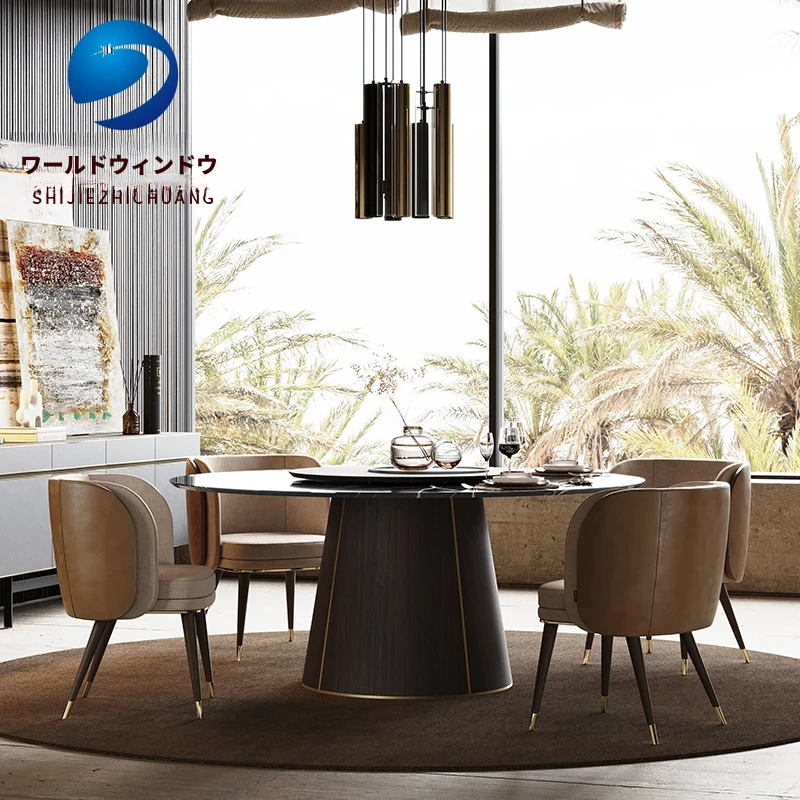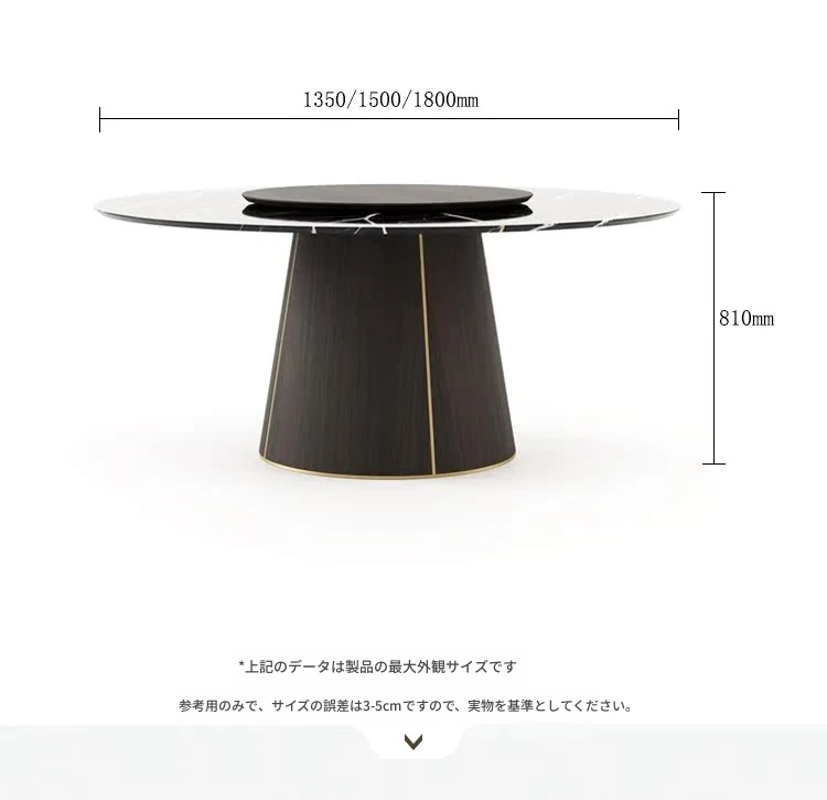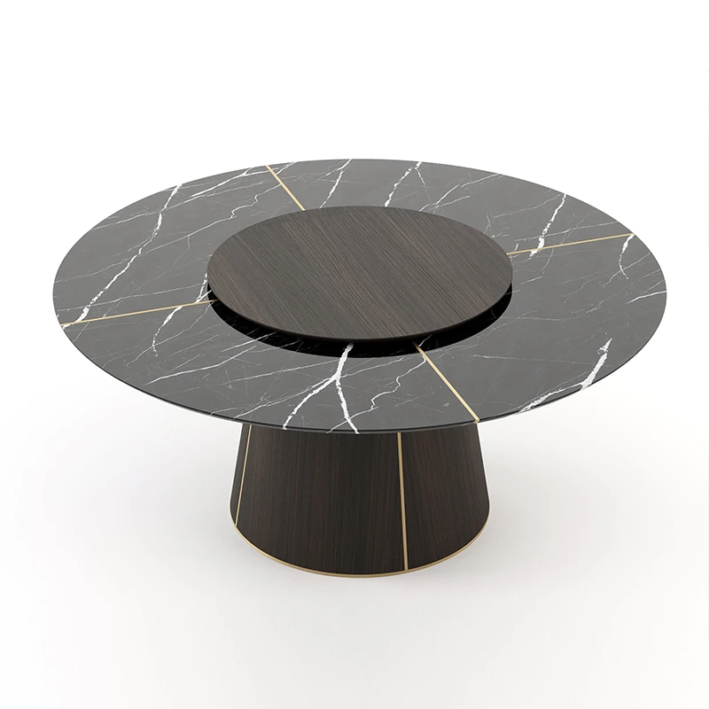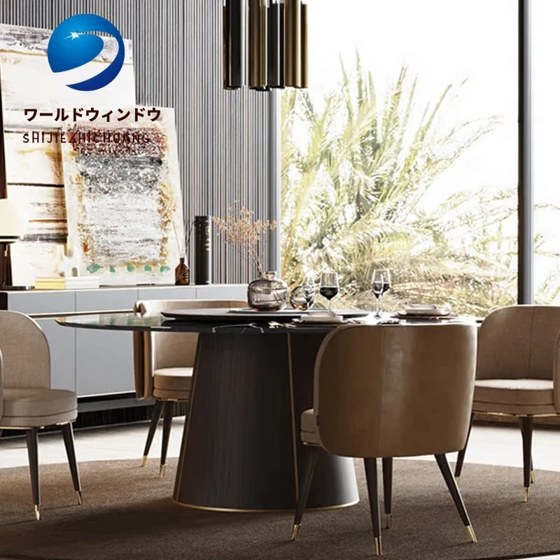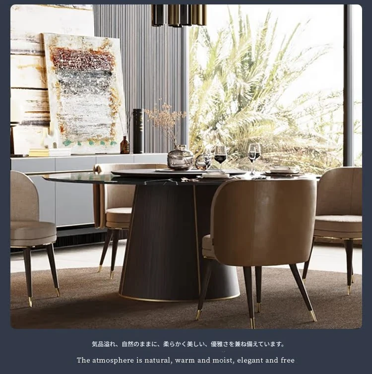モダンでシンプルなラグジュアリー、天然木と大理石の円形ダイニングテーブル。小さな家でもぴったりのスタイリッシュな食卓。別荘やクラブハウスにも最適な家具です。