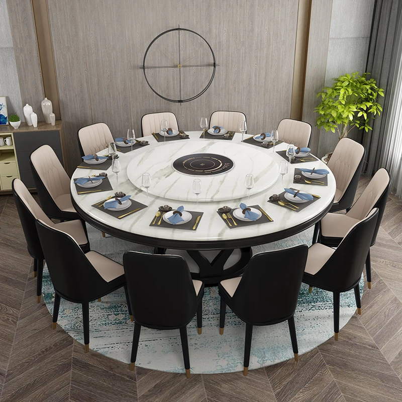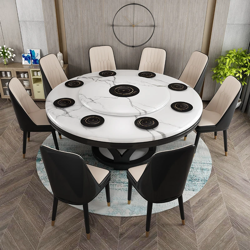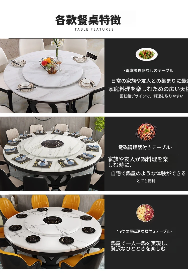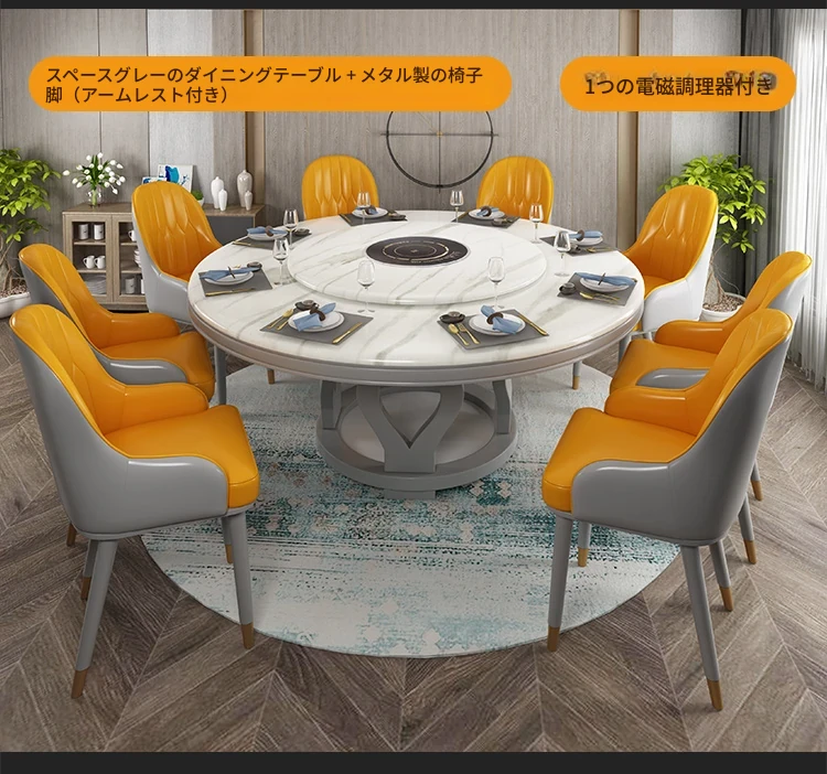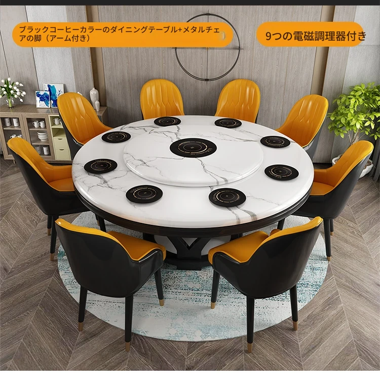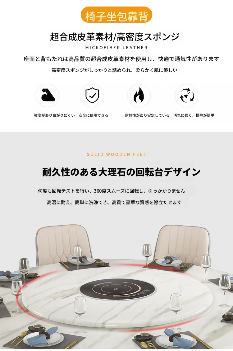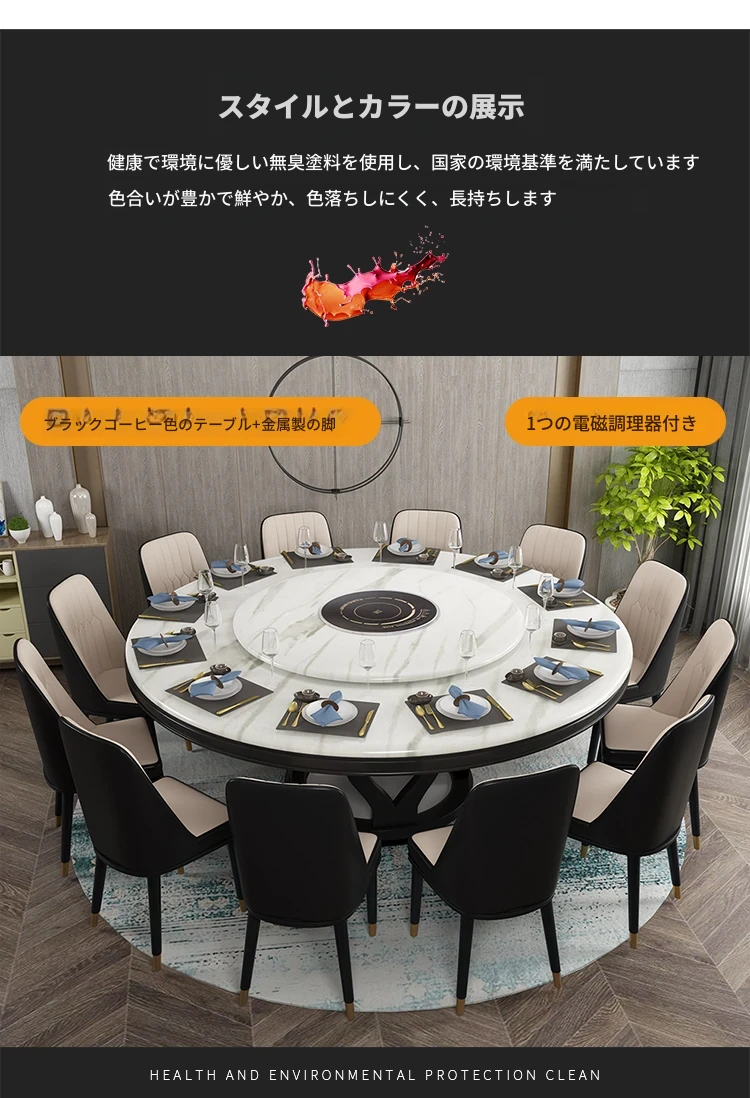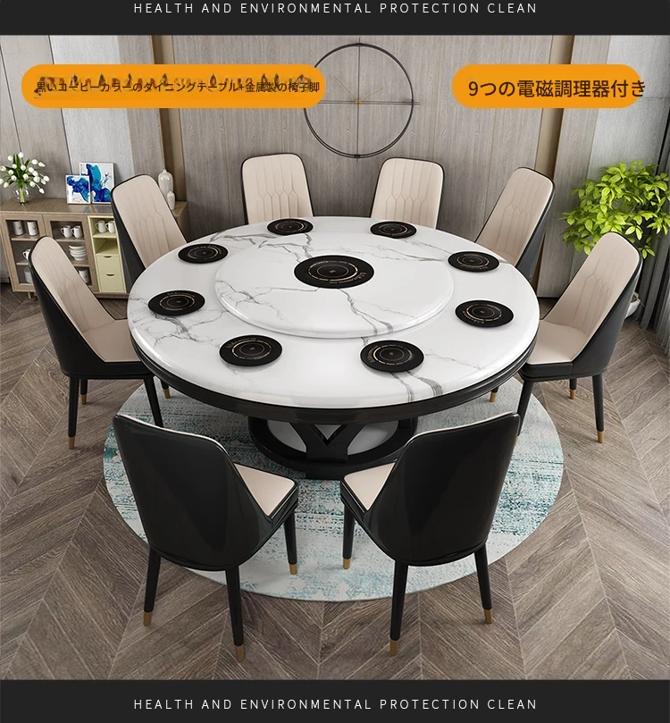 モダンシンプルな大理石ダイニングテーブルセット|10人用実木ラウンドテーブル|家庭やホテルに最適|電磁調理器&鍋料理対応|快適な食事体験を提供!