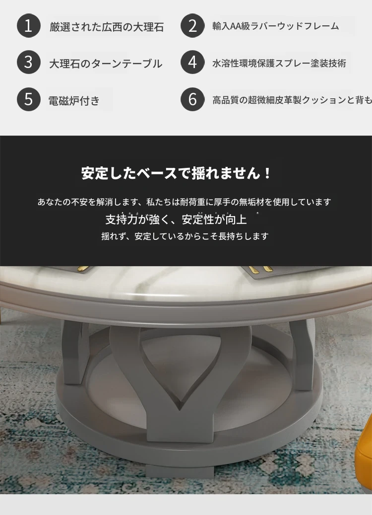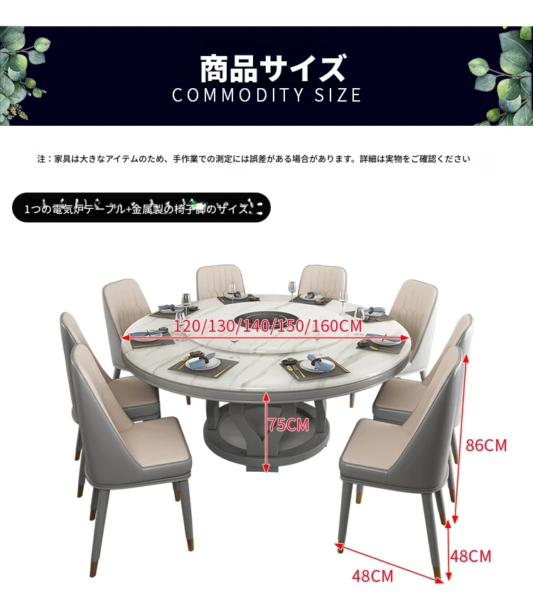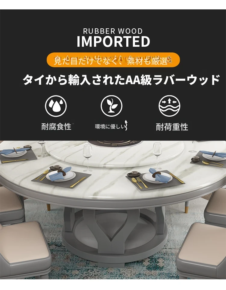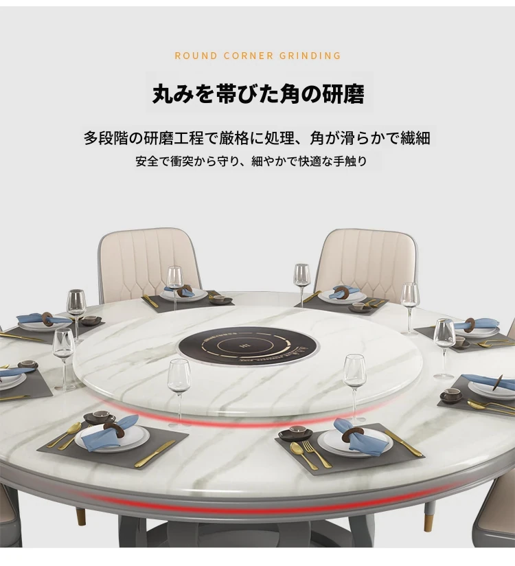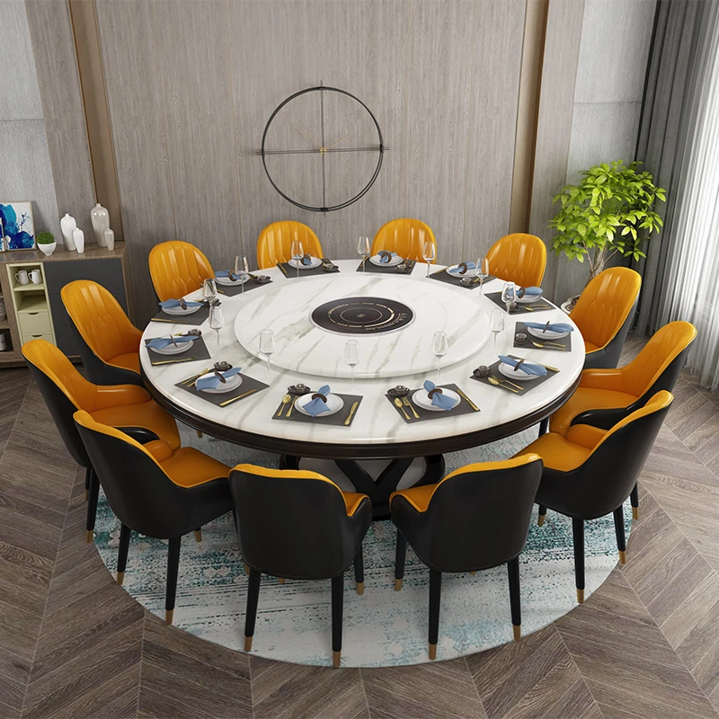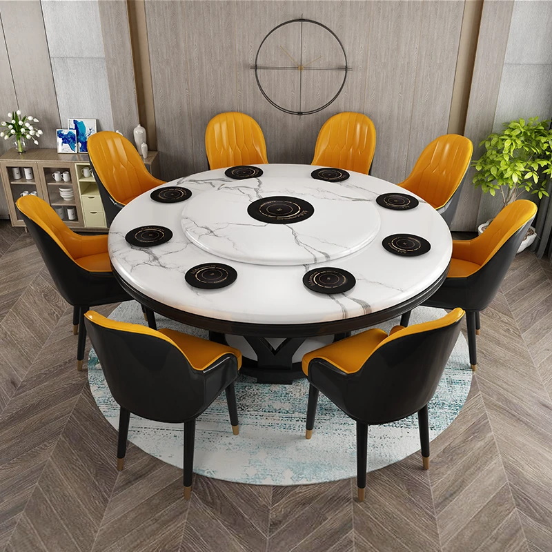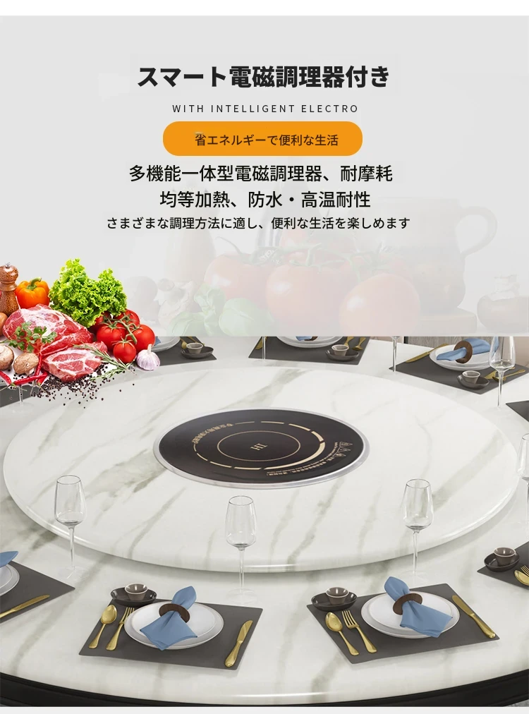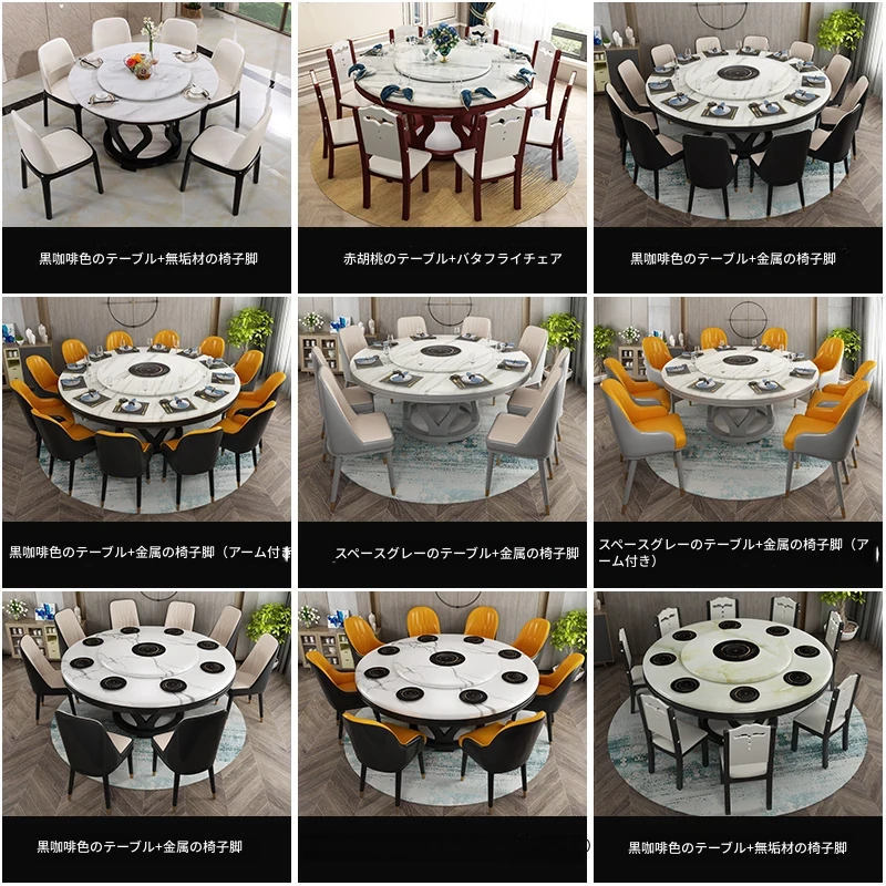 モダンシンプルな大理石ダイニングテーブルセット|10人用実木ラウンドテーブル|家庭やホテルに最適|電磁調理器&鍋料理対応|快適な食事体験を提供!