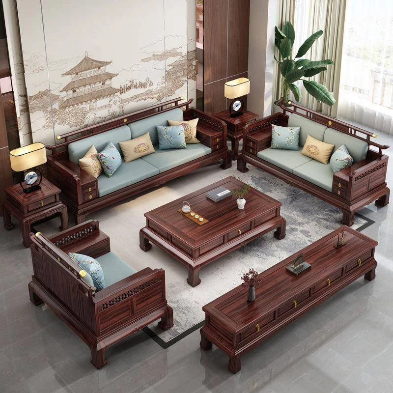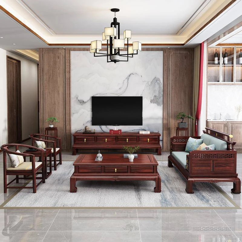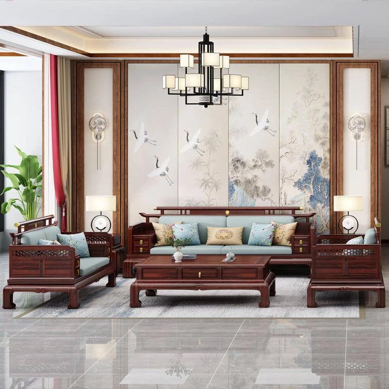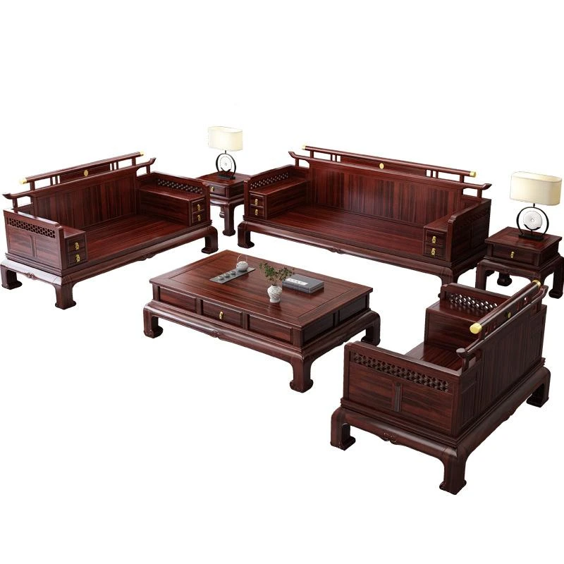 新しい客間を彩る!中式全実木ウーキン木製ソファセット - 冬も夏も使えるスタイリッシュな6510新古典的な赤色デザイン。快適さと美しさを兼ね備えた贅沢な空間を演出します!