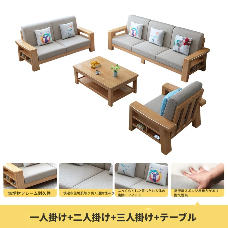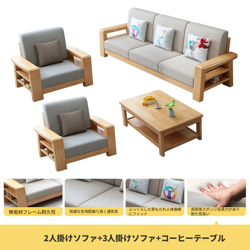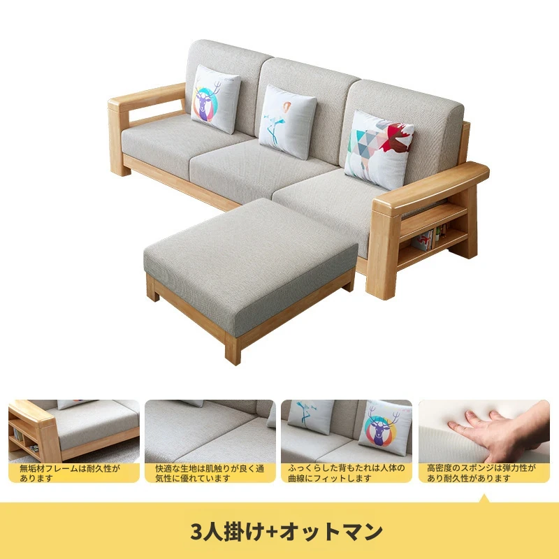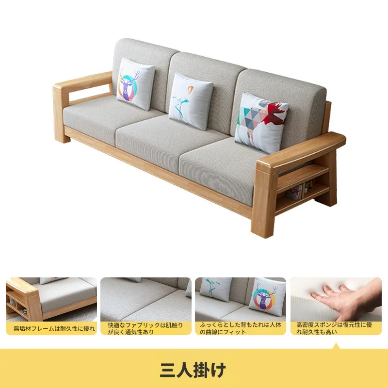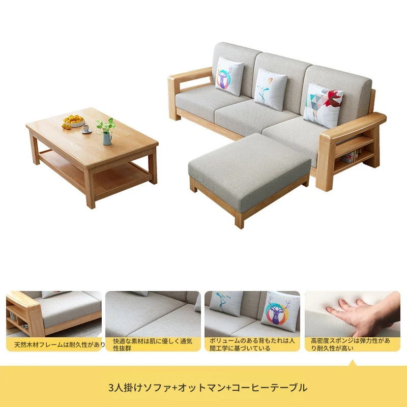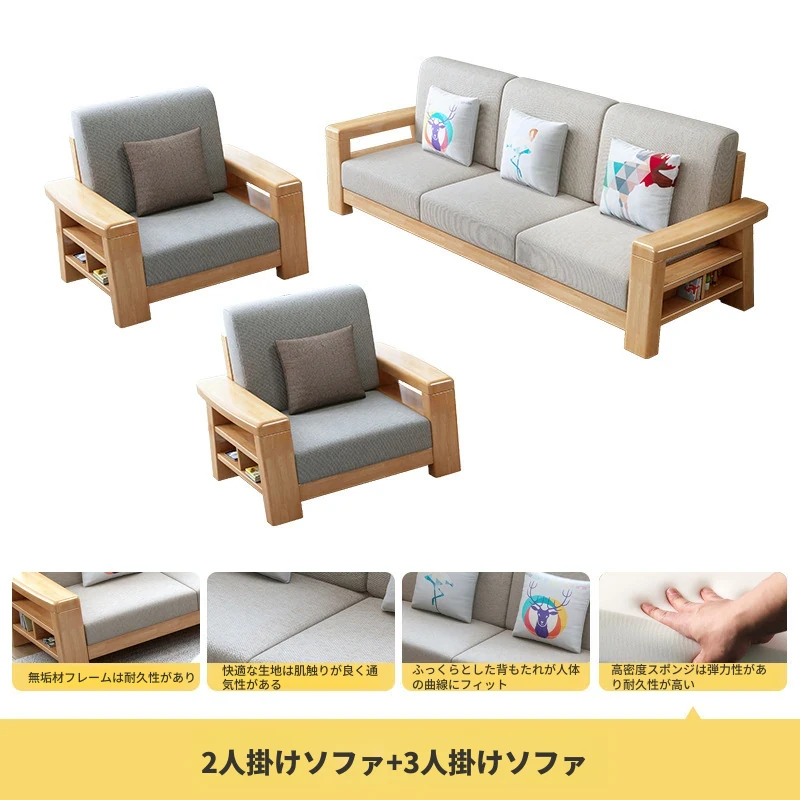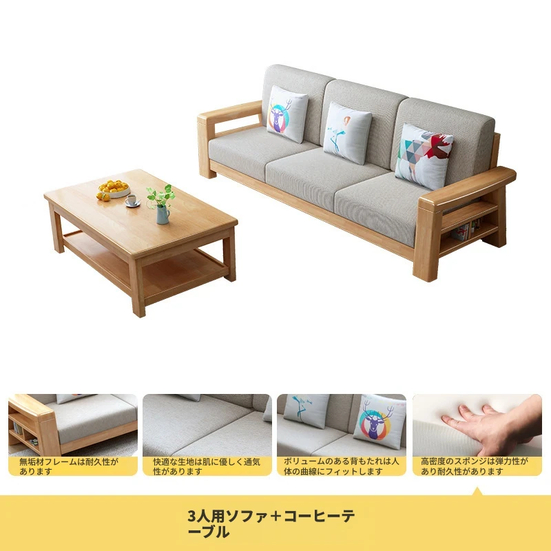 北欧スタイルの無垢材ソファ|現代的でシンプルなデザイン|小型リビングに最適な3人掛け布製カウチソファセット|メーカー直販でお求めやすく!