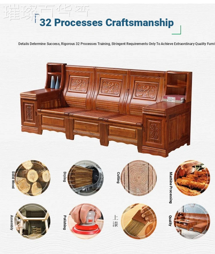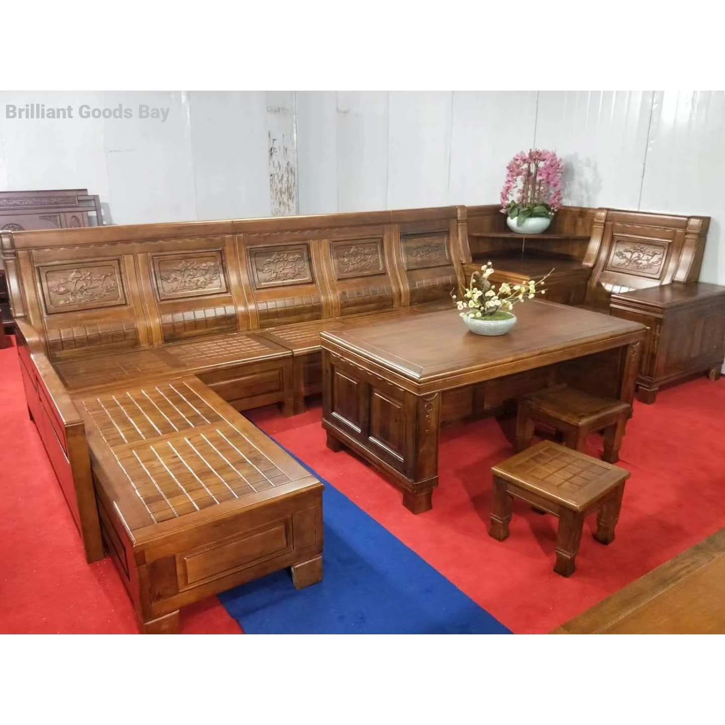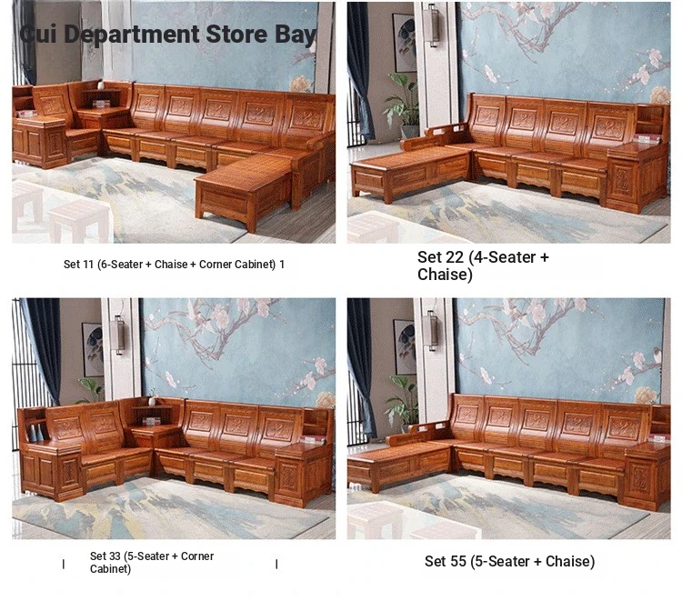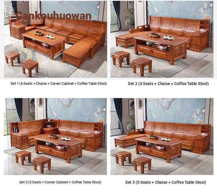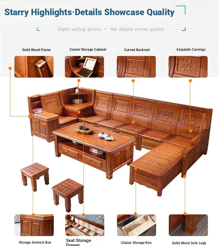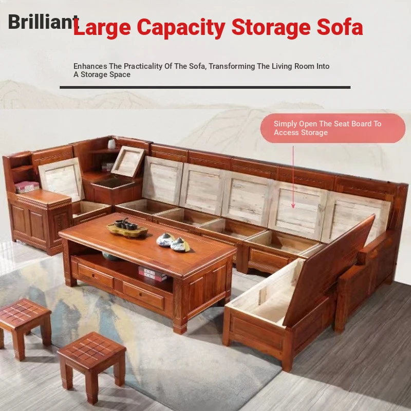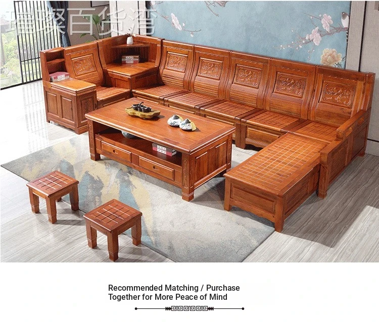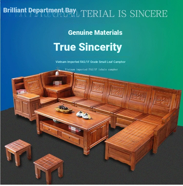 Solid Wood L-Shaped Sofa Set with Chaise Lounge - Versatile Design for Living Room or Office, Includes Coffee Table - Made from Aromatic Camphor Wood for Year-Round Comfort