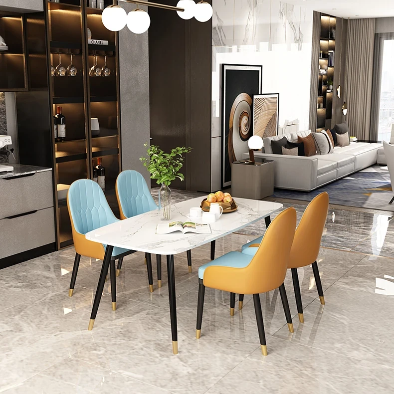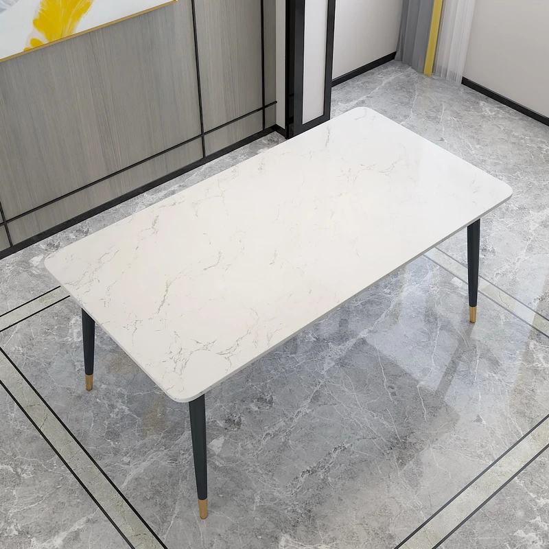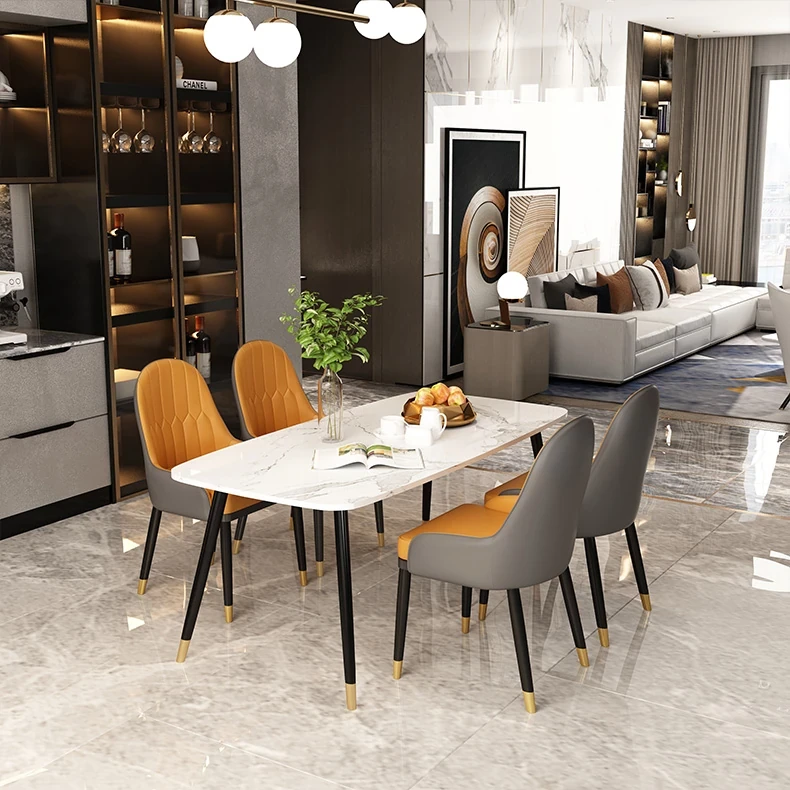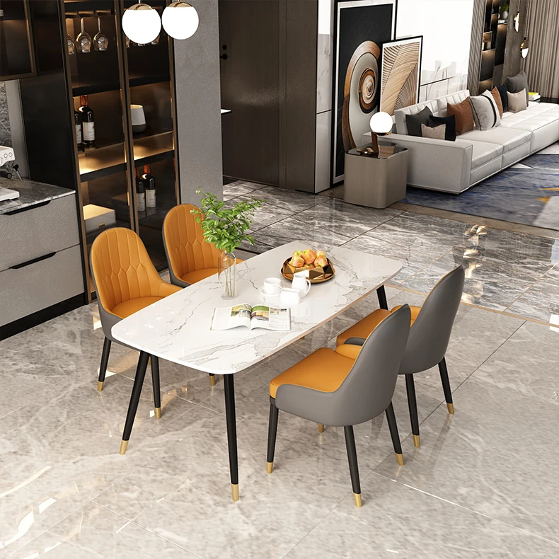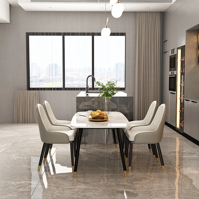 ミニマリストデザインの大理石ダイニングテーブルセット - 小型住宅向け、四人用の長方形テーブルと椅子のコンビネーションで、温かみのある食事空間を演出します。