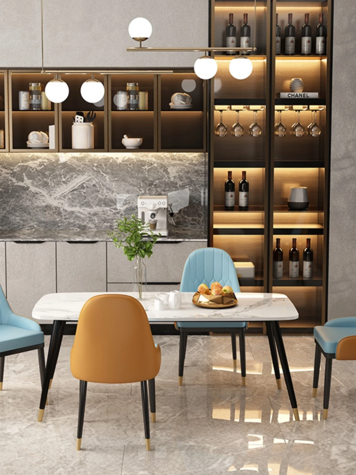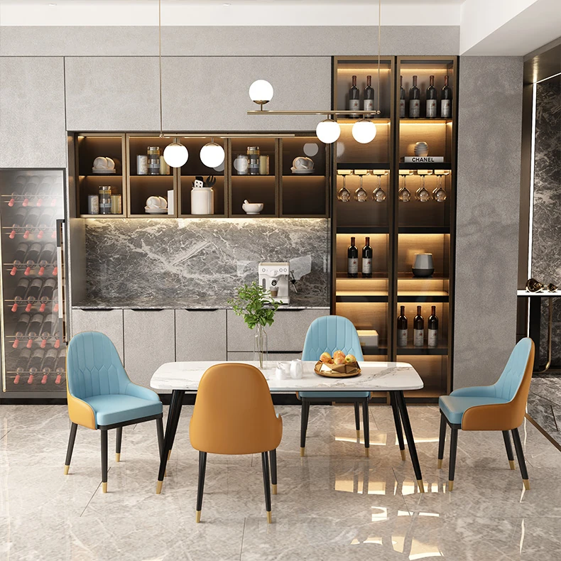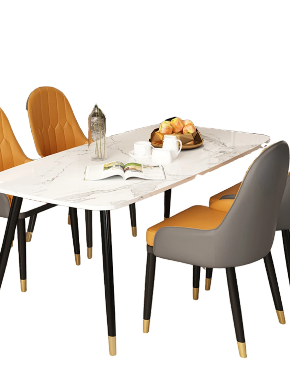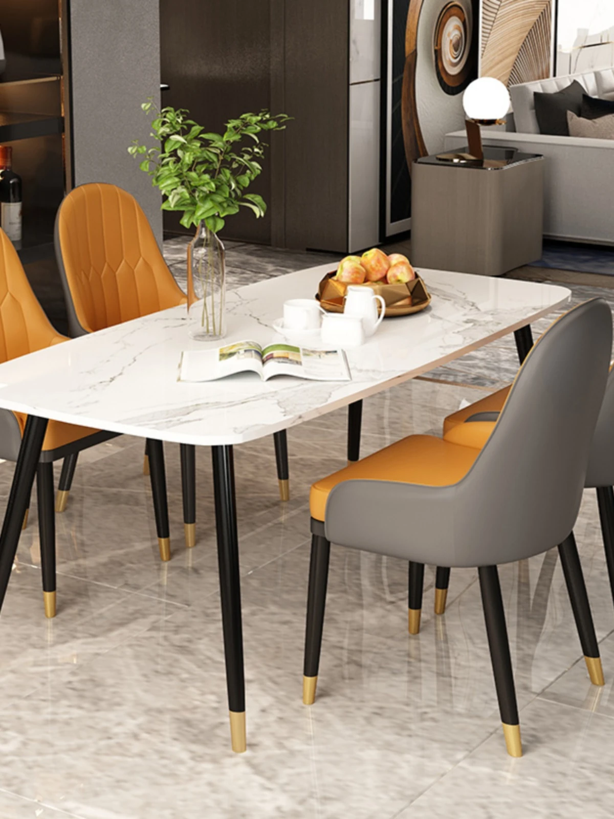ミニマリストデザインの大理石ダイニングテーブルセット - 小型住宅向け、四人用の長方形テーブルと椅子のコンビネーションで、温かみのある食事空間を演出します。