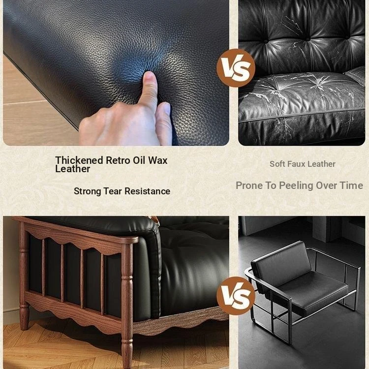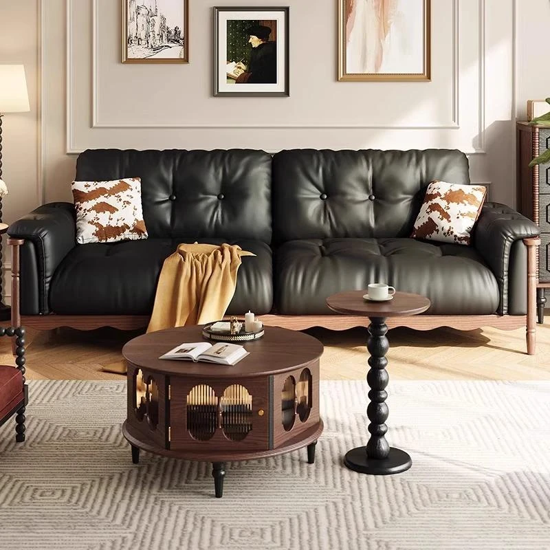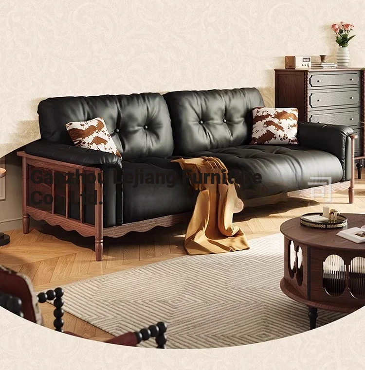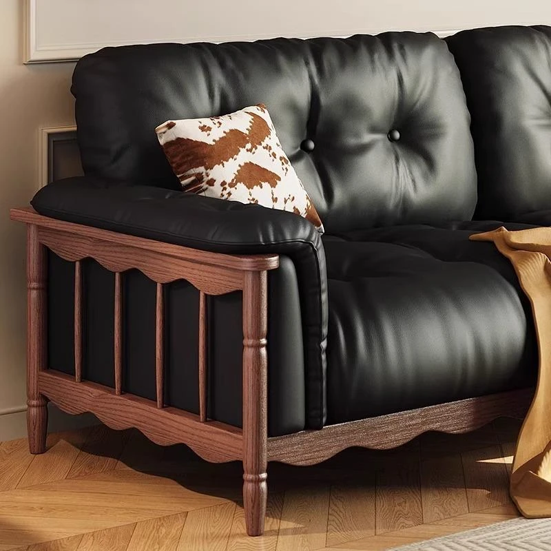Vintage Black Sugar Cloud Solid Wood Sofa - French Retro Style for Living Room, Perfect for Villas - Elegant Black Waxed Elm Design