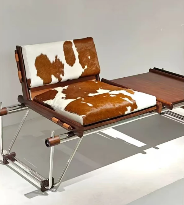 ヴィンテージ風のミルクカウレザーコーヒー&ニュースチェア、アートベンチ、ウォールナット&ステンレススチール製、バウハウスデザインの雑誌ラック!おしゃれなインテリアにぴったり、あなたの空間を格上げします。