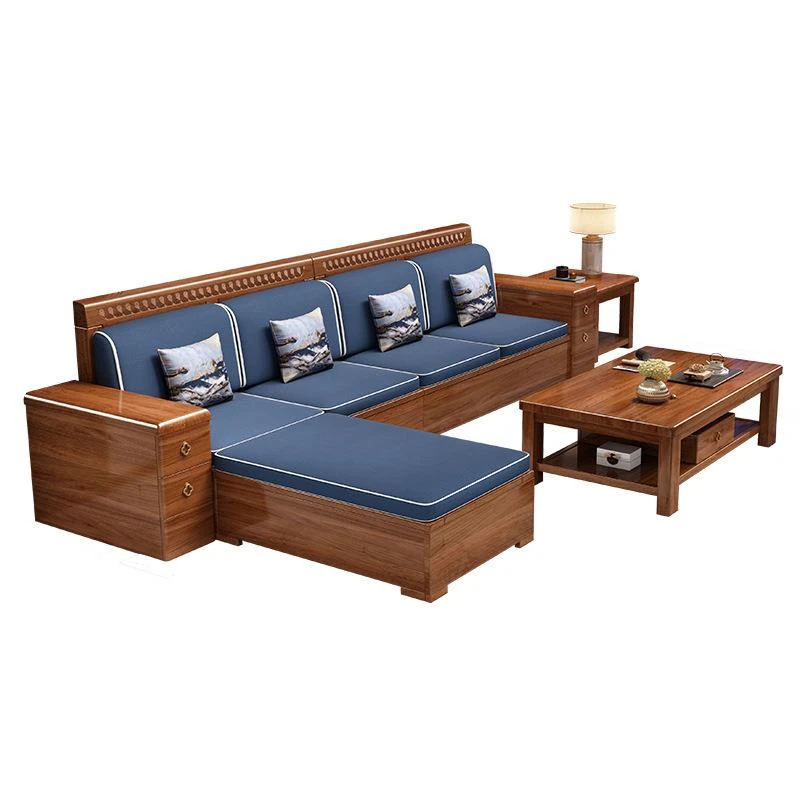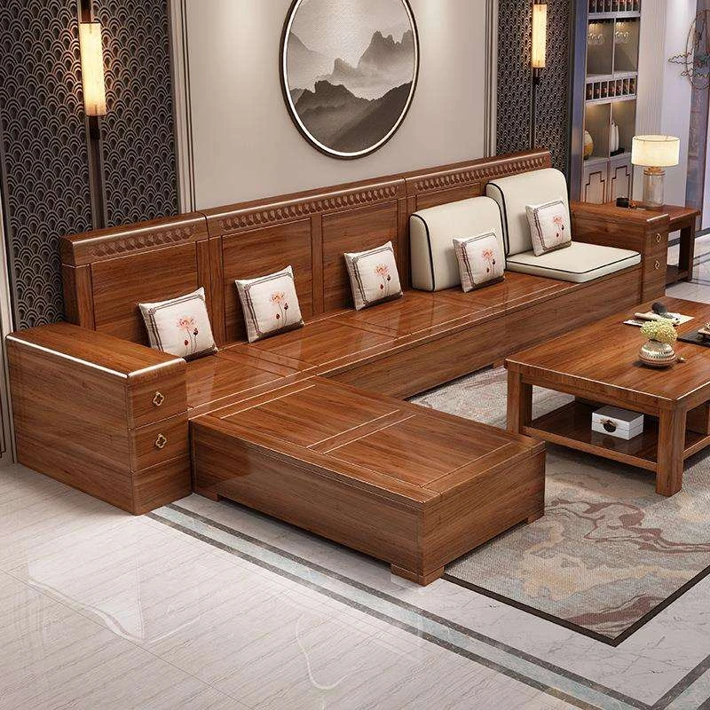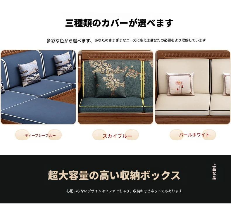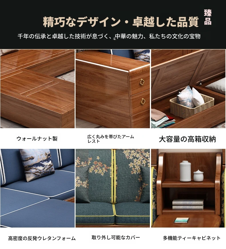 冬夏兼用の高箱収納付き胡桃木無垢材ソファセット|大・小サイズ対応|中華風デザインでおしゃれなリビングに最適!
