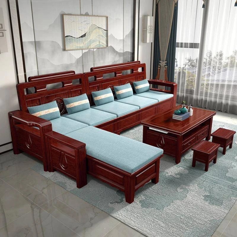New Chinese Style Solid Wood Sofa - 3-Seater Corner Design for Living Room, Perfect for All Seasons, Ideal for Spacious Homes.